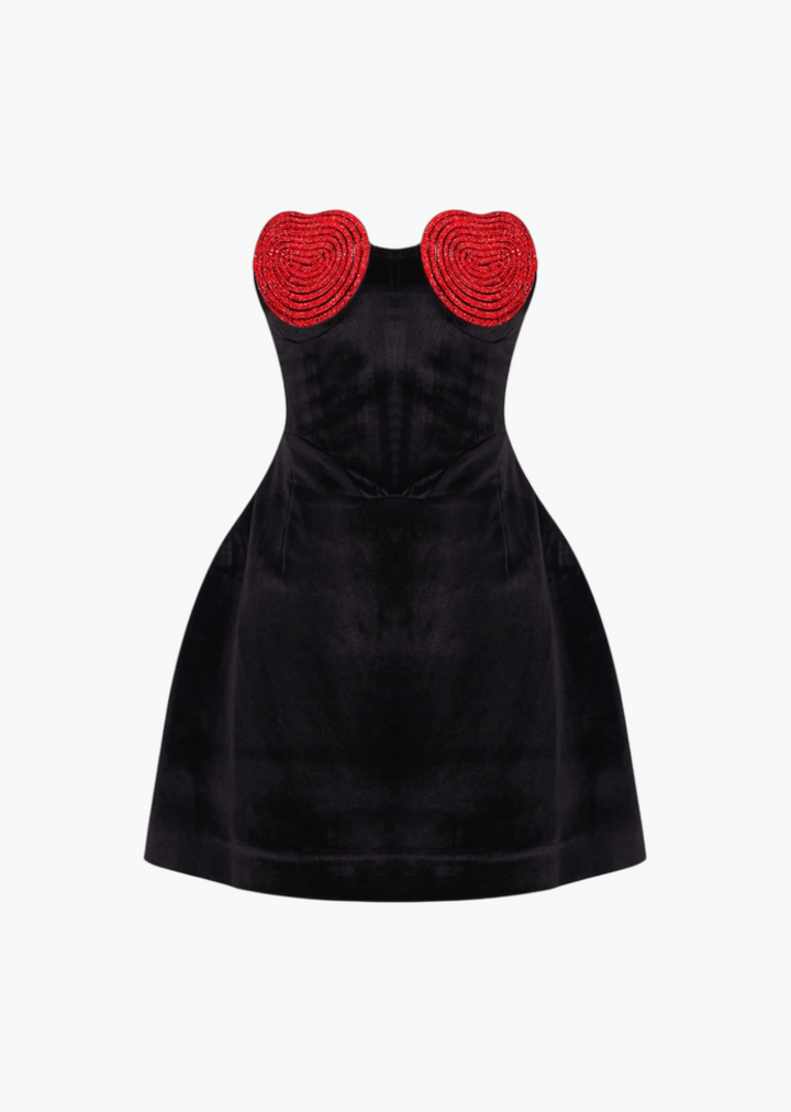 This playful and captivating mini dress features a strapless neckline and a flattering A-line silhouette. The dress is crafted from a soft velvet-like material. The most distinctive detail is the two rhinestone-encrusted heart appliqués positioned prominently over the bust. It has a concealed back zipper for a smooth fit.