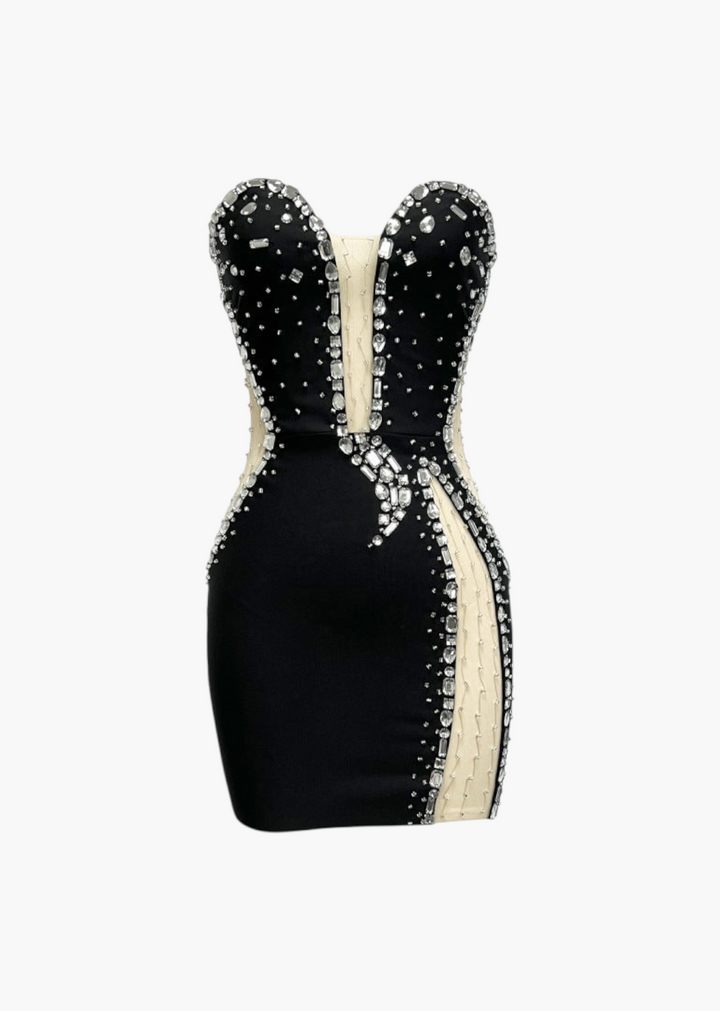 This mini dress features a strapless neckline and a bodycon silhouette. The design is highlighted by a sheer mesh insert on one side, which is framed by a border of large rhinestones. The other side of the bodice and the skirt are made from a structured, form-fitting fabric. The combination of textures and embellishments creates a modern and glamorous look, perfect for a party or a night out.