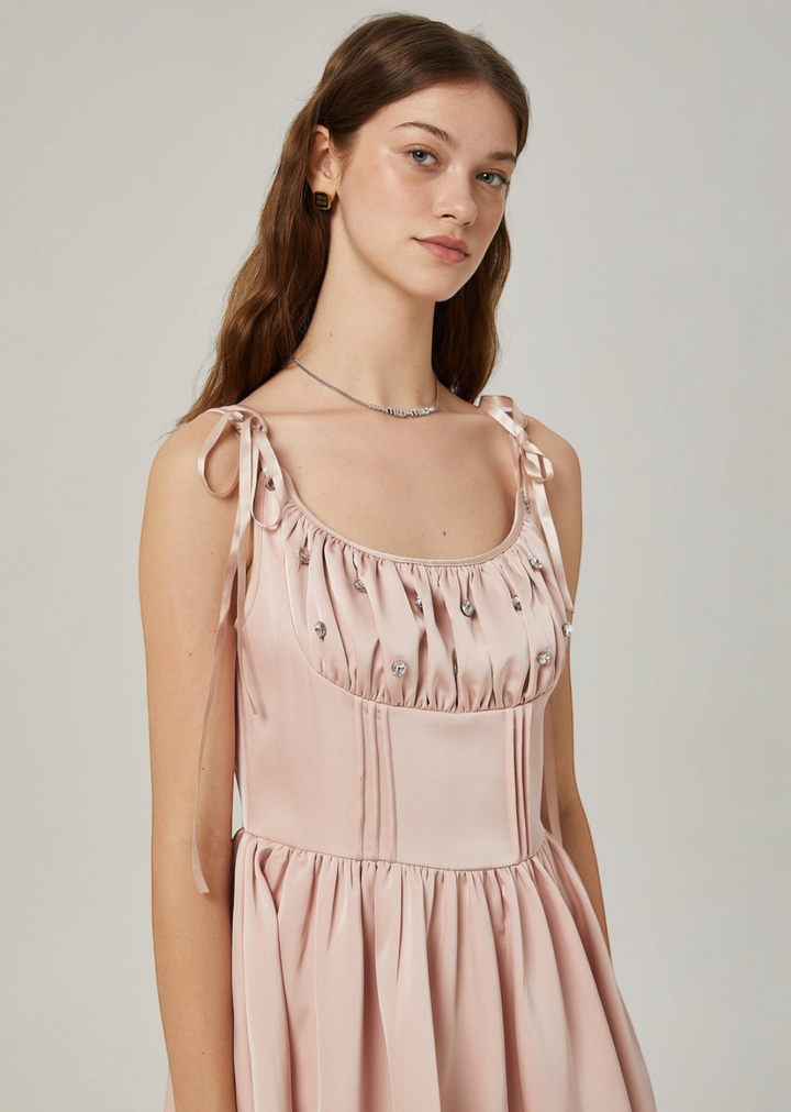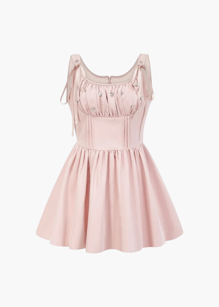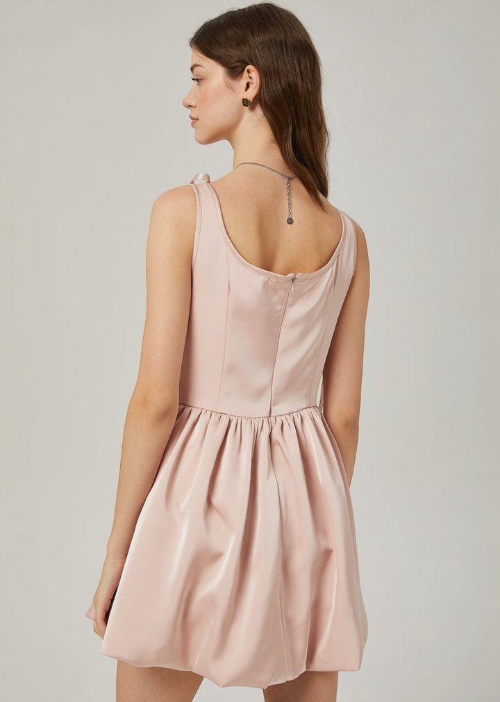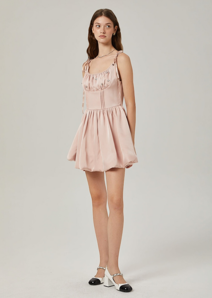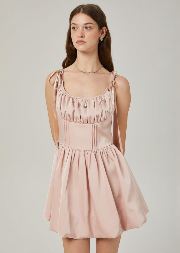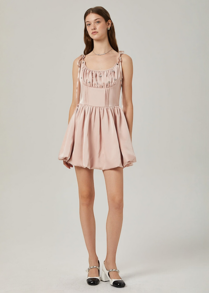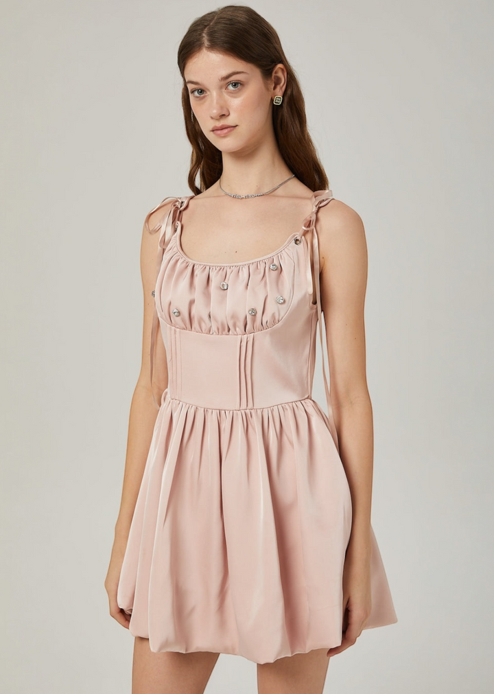 This babydoll mini dress is a charming and versatile addition to any wardrobe. It features delicate rhinestone accents along the bust, adding a touch of sparkle. The adjustable tie straps and pleated bodice allow for a customized and comfortable fit. The skirt has a flattering bubble silhouette, perfect for a flirty and fun look. The dress is made from a soft satin-like fabric that drapes beautifully.
