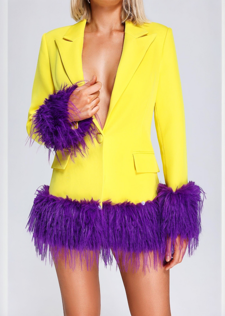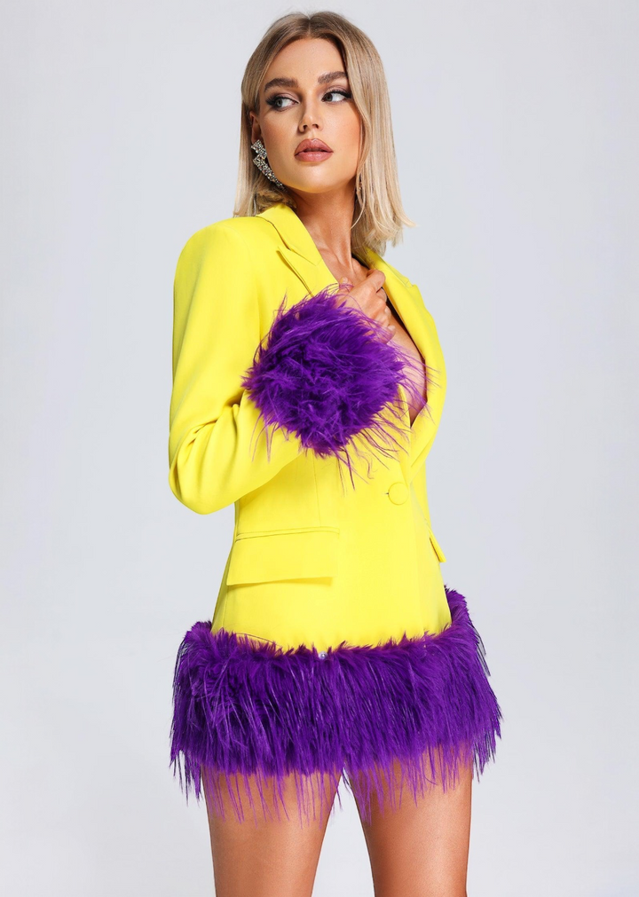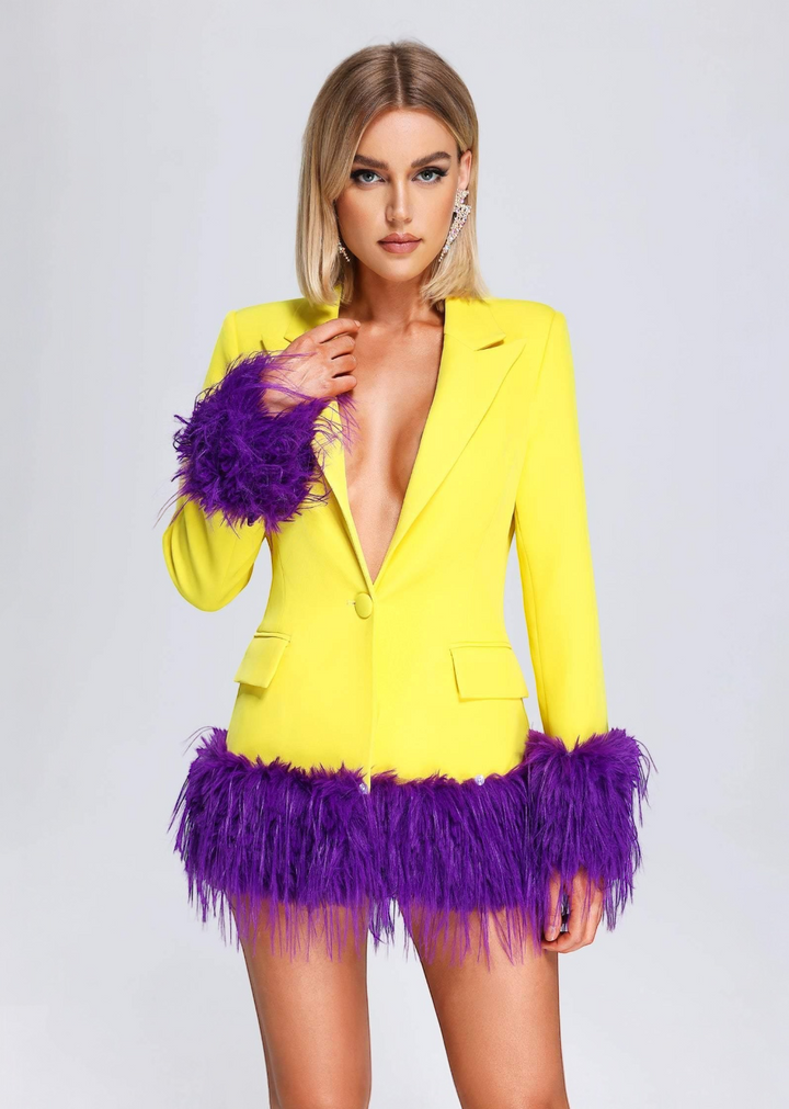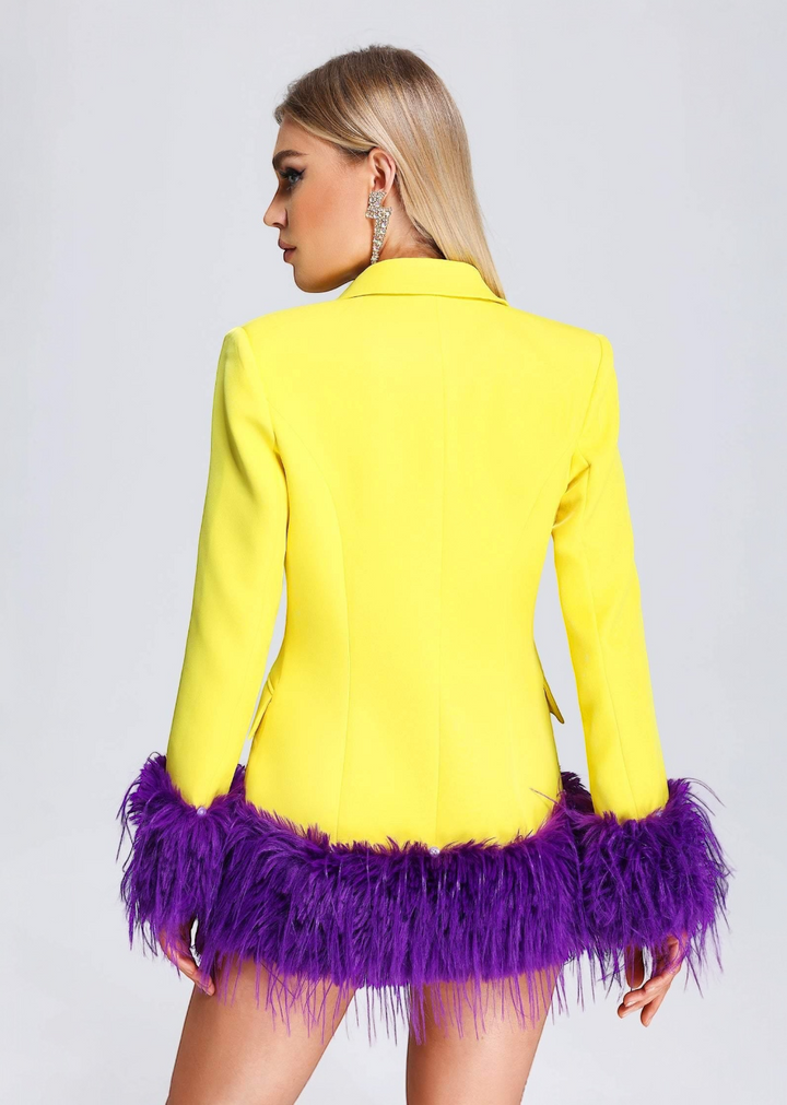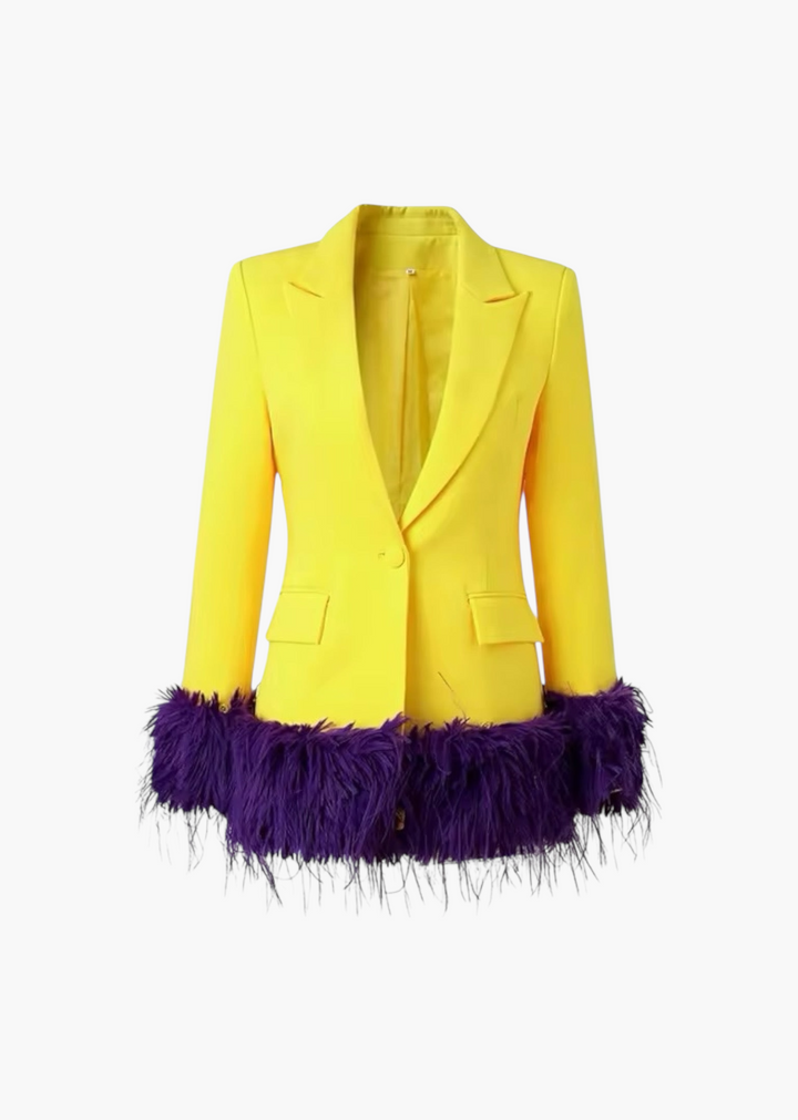 This tailored blazer features a single-button closure and classic notched lapels. The design is elevated by a dramatic feather trim along the hemline and cuffs, adding a playful and luxurious touch to the structured silhouette. The blazer has a fitted waist and two front flap pockets for a polished look.