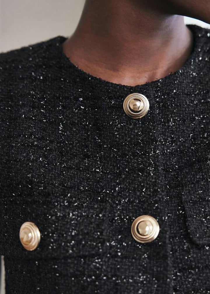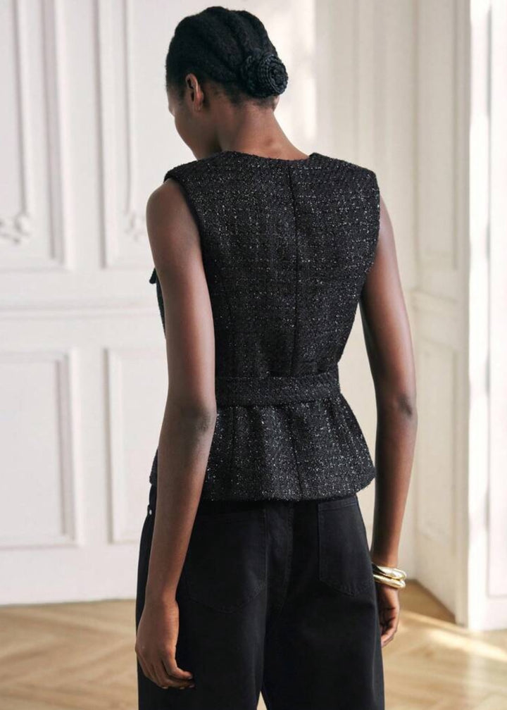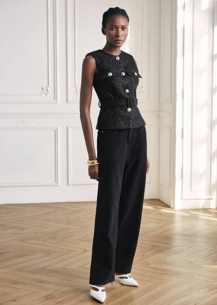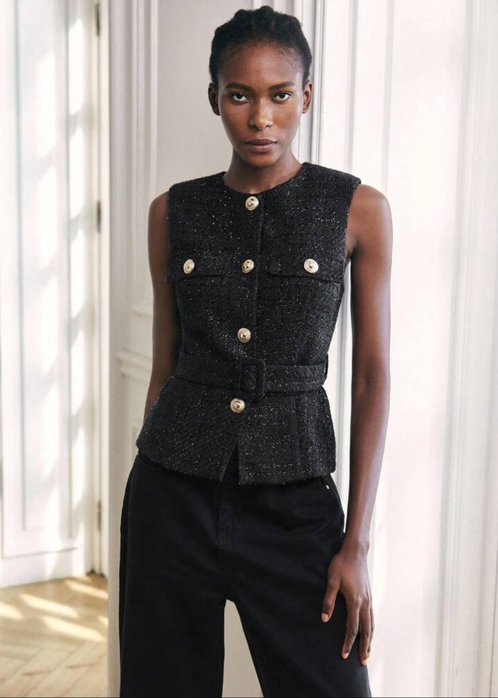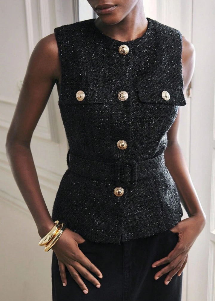 Style Tips This vest can be worn as a standalone top or layered over a thin blouse or shirt. Pair it with tailored trousers or a skirt for a sophisticated look, or with jeans for a chic casual outfit. Accessorize with simple gold jewelry to complement the buttons.