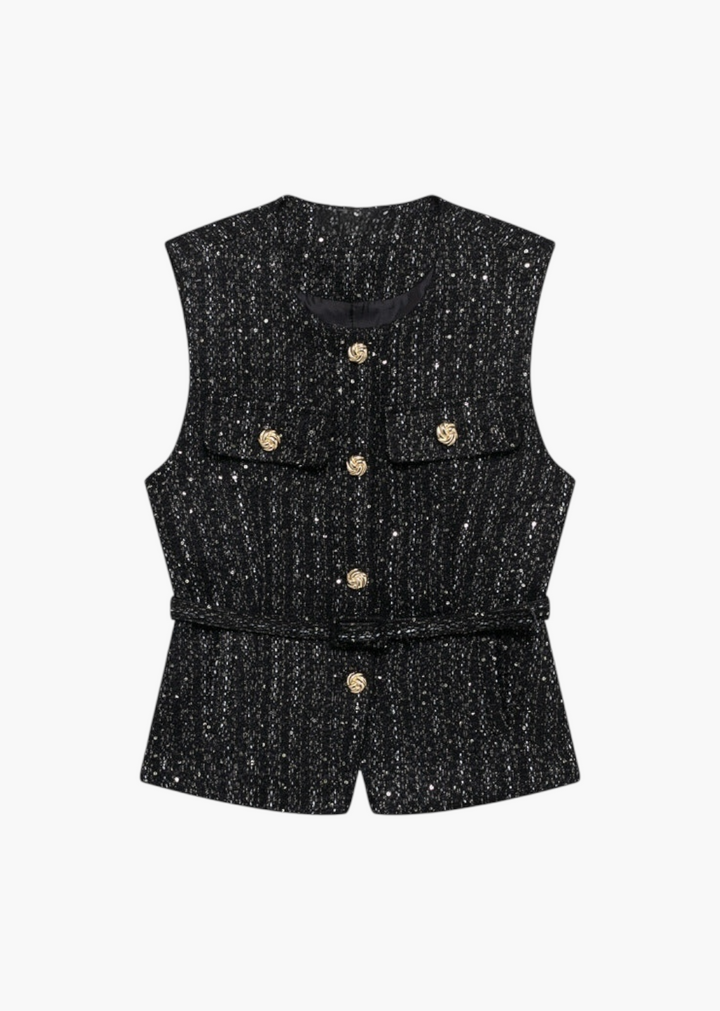 This vest top features a round neckline and a sleeveless design. It has a full button-front closure with embossed gold-toned buttons and includes two chest pockets with flap and button details. A matching belt cinches the waist, creating a tailored and flattering silhouette. The fabric has a subtle textured finish.