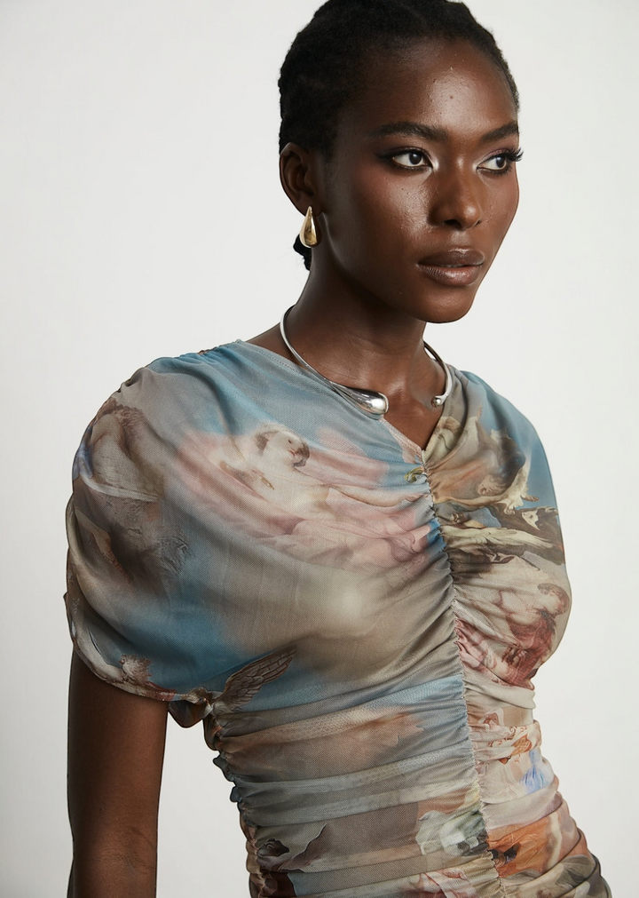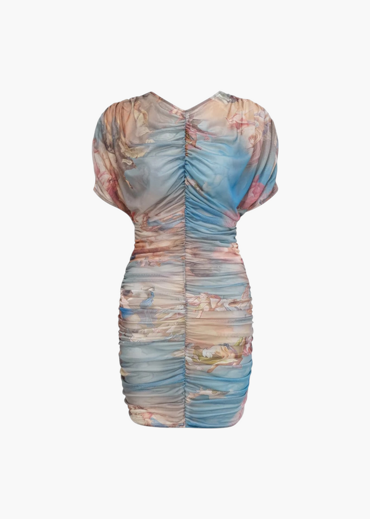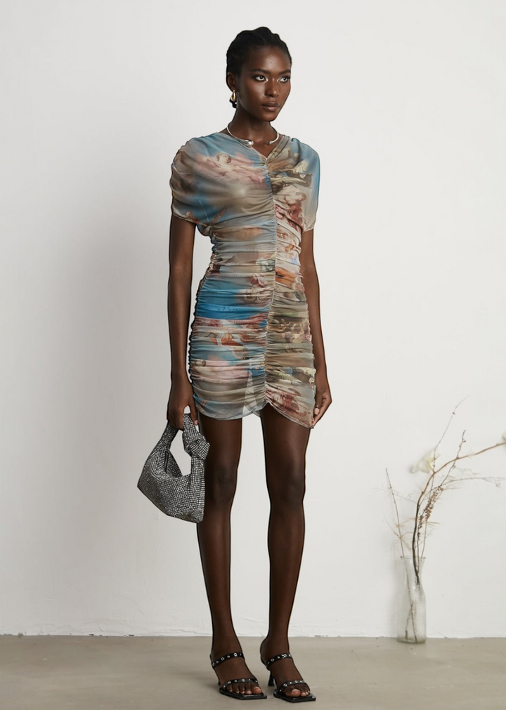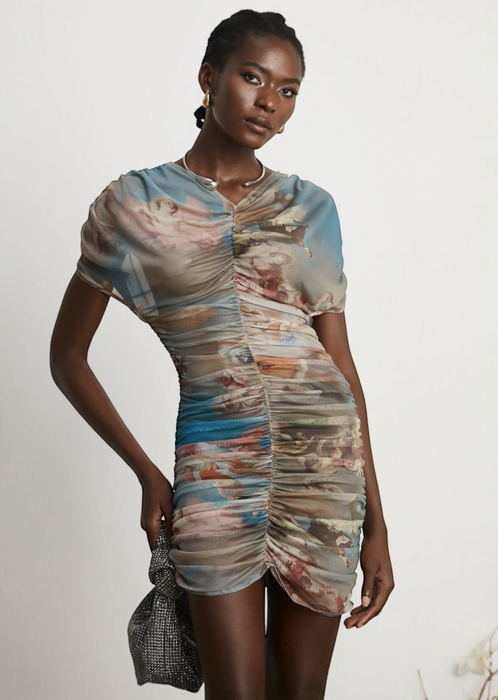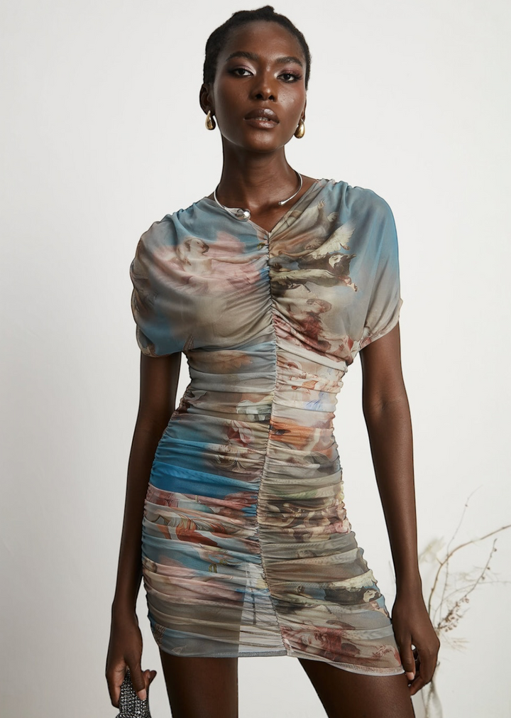 This striking mini dress features a unique, all-over art-inspired print on a sheer mesh overlay. The bodycon silhouette is enhanced by all-over ruching, creating a flattering and textured look that molds to the body. It has short, draped and a v-neckline, adding to its fluid design. A comfortable, opaque lining ensures a smooth and confident fit. This dress is a true statement piece that blends art with modern style.