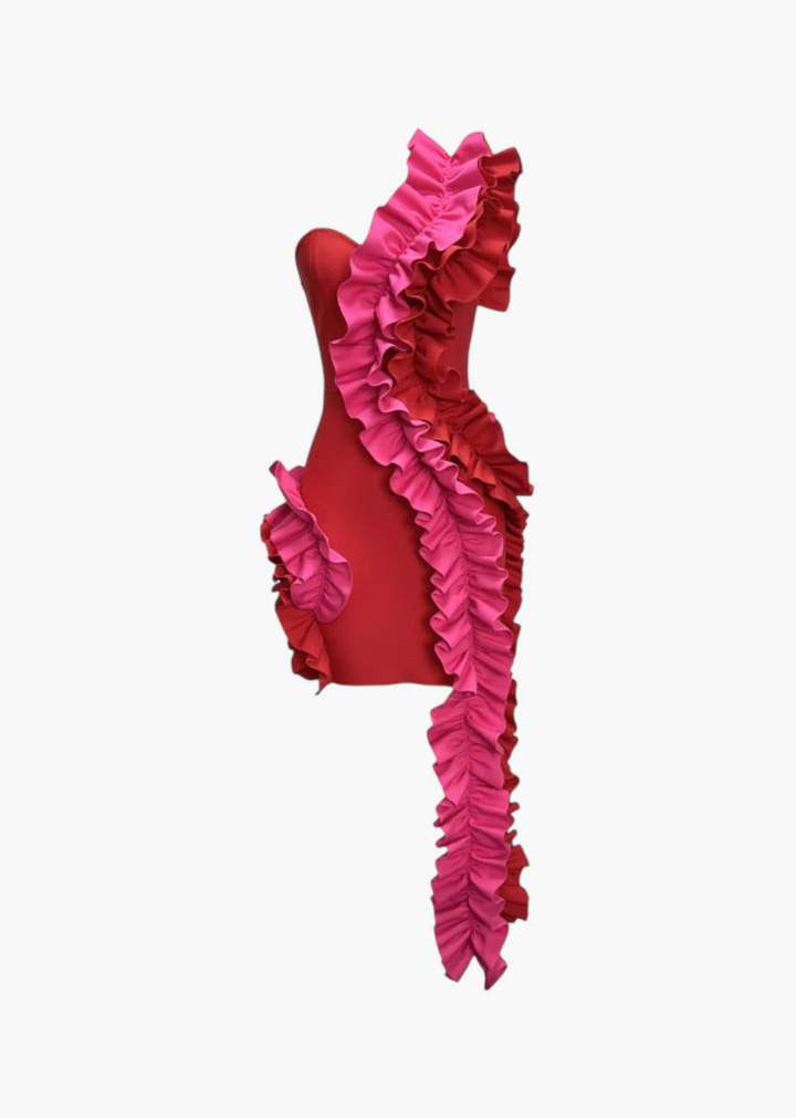 This striking mini dress is a true statement piece, designed to captivate with its dramatic silhouette. It features a one-shoulder design that transitions into a cascade of voluminous ruffles, which flow from the single shoulder down the front of the body and continue around to the back. The fitted bodice and mini length create a modern, party-ready look, while the layered ruffle details add dynamic texture and movement. A secure closure is located at the back for a smooth and comfortable fit. This dress is perfect for cocktail parties, nights out, and any occasion where you want to make a bold and memorable entrance.