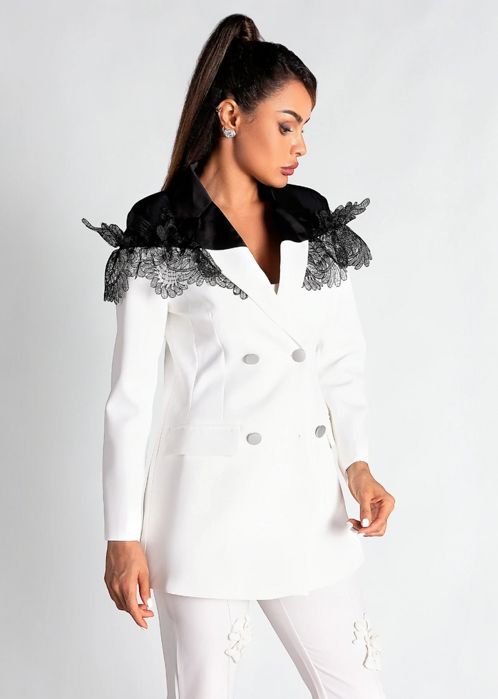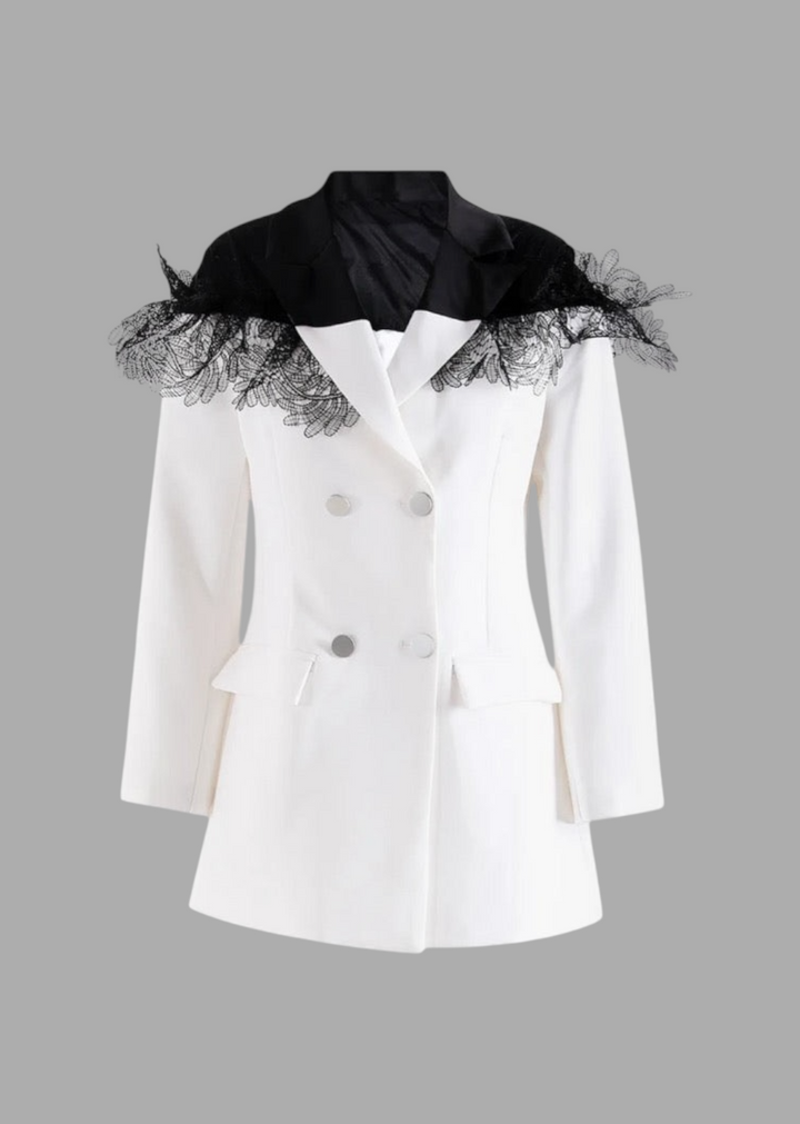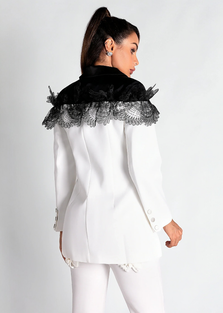 This tailored blazer features a double-breasted design with a structured fit. The stand-out features are the lace-trimmedyoke and padded shoulders that create a unique, dramatic silhouette. The front is detailed with multiple button closures, while the overall design offers a modern, sophisticated twist on classic suiting.