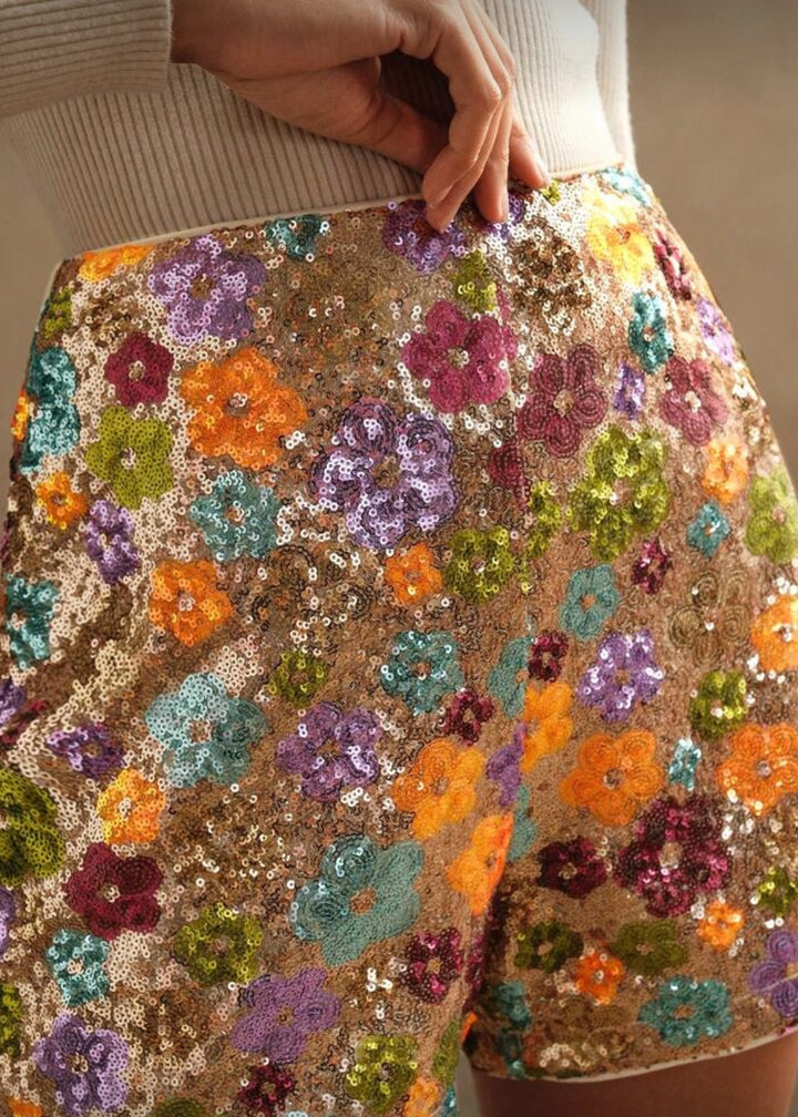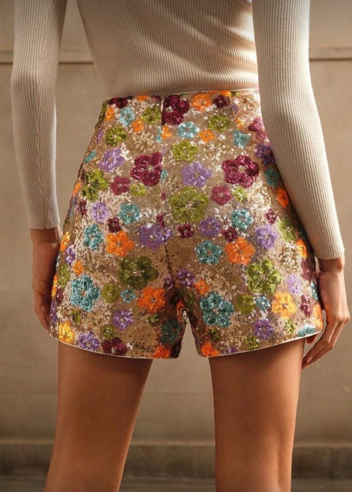 These shorts are a statement piece, fully adorned with vibrant sequin embellishments arranged in a delightful floral pattern. They feature a high-waisted design and a tailored fit, making them both stylish and flattering. The shimmering texture catches the light, perfect for adding a touch of glamour to any outfit.