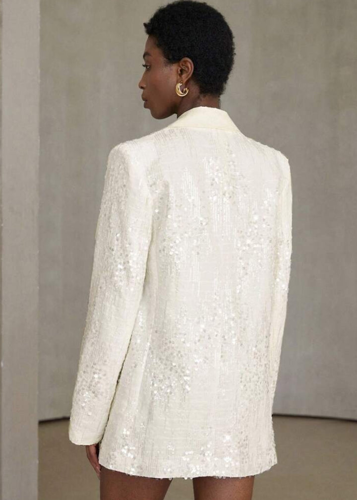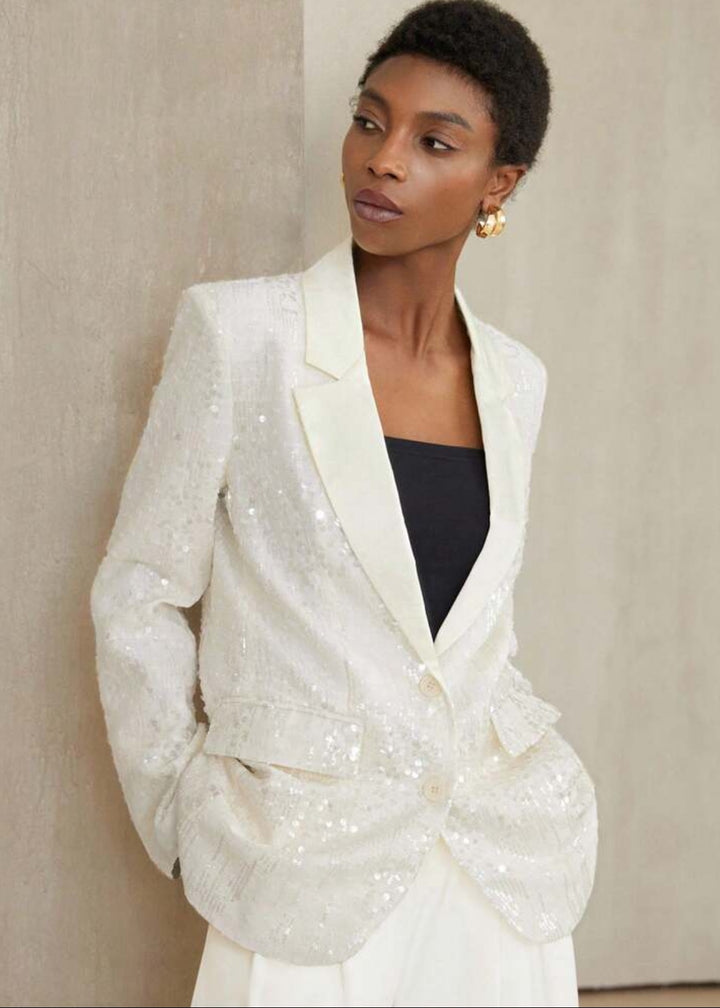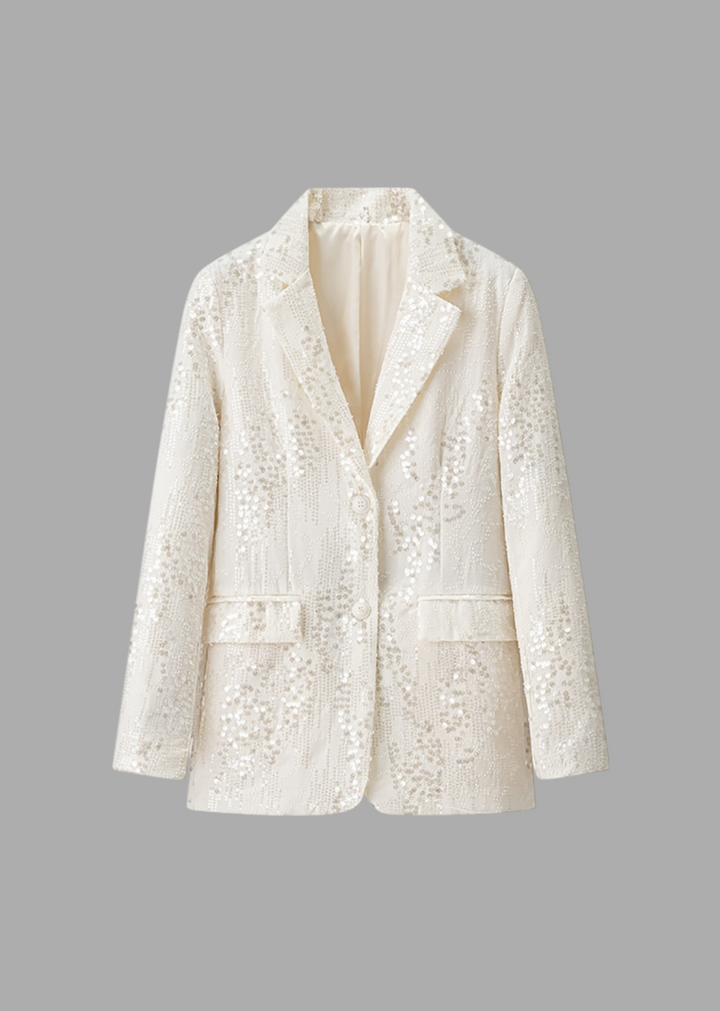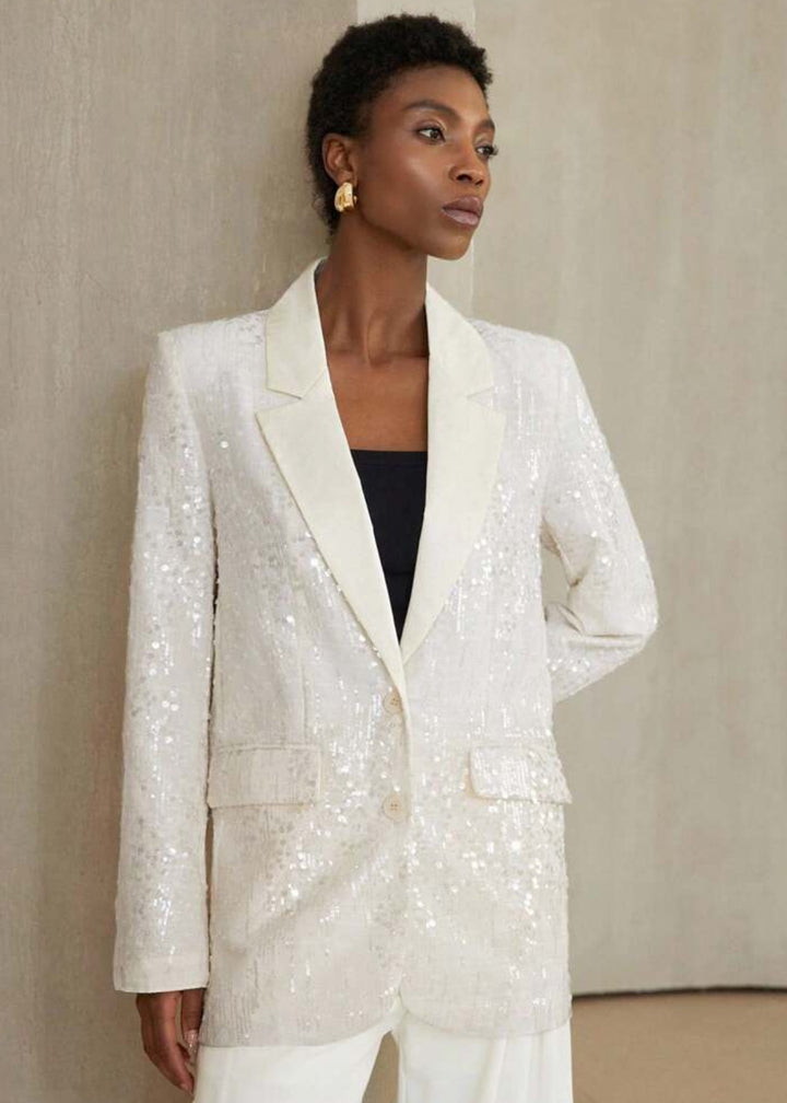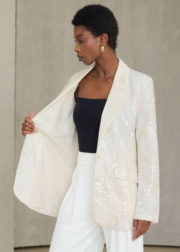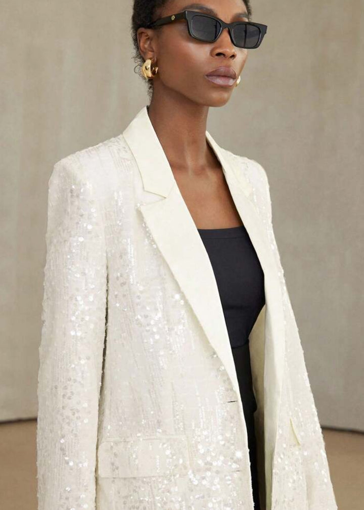 This blazer is an elegant and modern piece featuring an all-over sequin embellishment for a sparkling finish. The structured design includes a single-button closure and a classic lapel, creating a sophisticated silhouette. This versatile piece is perfect for adding a touch of glamour to any outfit.