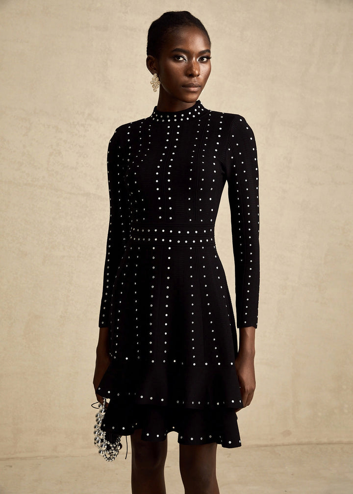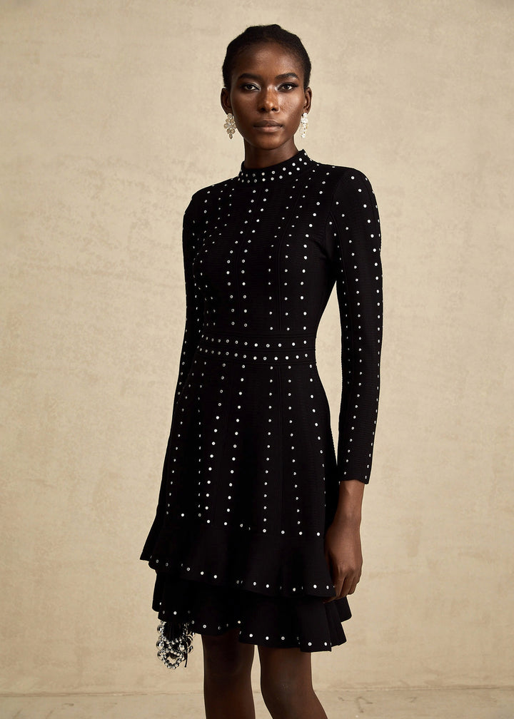 This mini dress combines classic sophistication with a modern, edgy twist. The dress features a high, mock neckline and long sleeves. It is adorned with a pattern of scattered studs, arranged in vertical lines that accentuate the length of the torso and sleeves. A defining feature is the tiered, ruffled skirt, which adds a playful element of movement and volume. The silhouette is designed to be fitted through the body, flaring out at the waist to create a flattering A-line shape. This versatile piece can be styled for various occasions, from a night out to a more formal gathering.