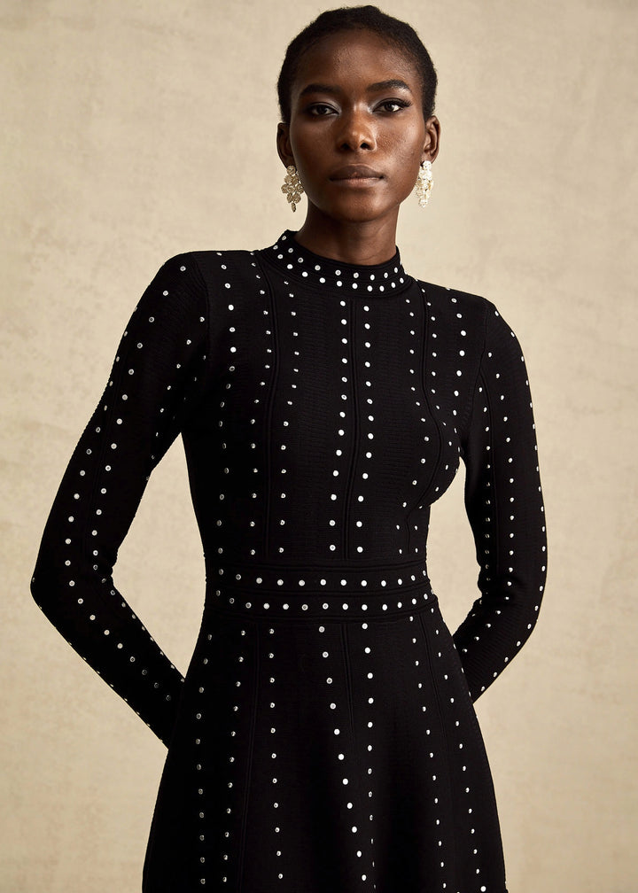 For a glamorous evening look, pair this dress with high heels and a clutch. Complement the stud detail with metallic or crystal accessories.