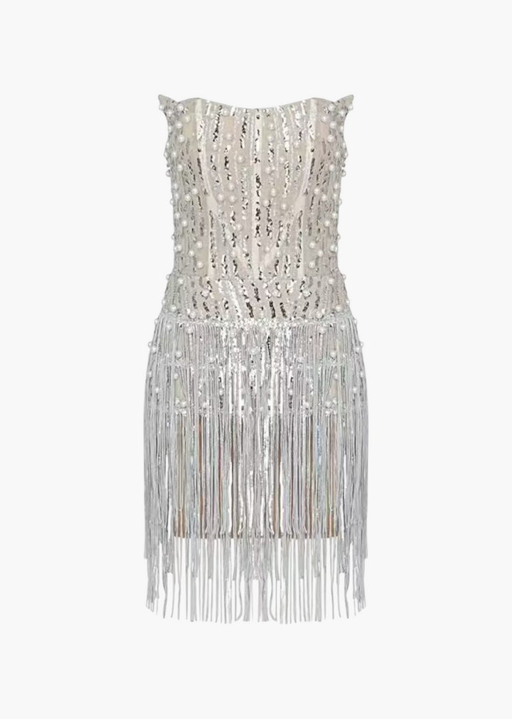 This mini dress is an absolute showstopper, designed for glamour and movement. It features a structured bustier bodice adorned with intricate vertical rows of beading and sequins that catch the light with every step. The standout feature is the full, cascading fringe skirt, which is composed of countless individual strands of sequins and beads, creating a mesmerizing shimmer and sway. The dress has a flattering mini length, perfectly balanced by the dynamic movement of the fringe. The back includes a zipper closure for a secure and smooth fit. This dress is perfect for a dance floor, a festive event, or any occasion where you want to be the center of attention.