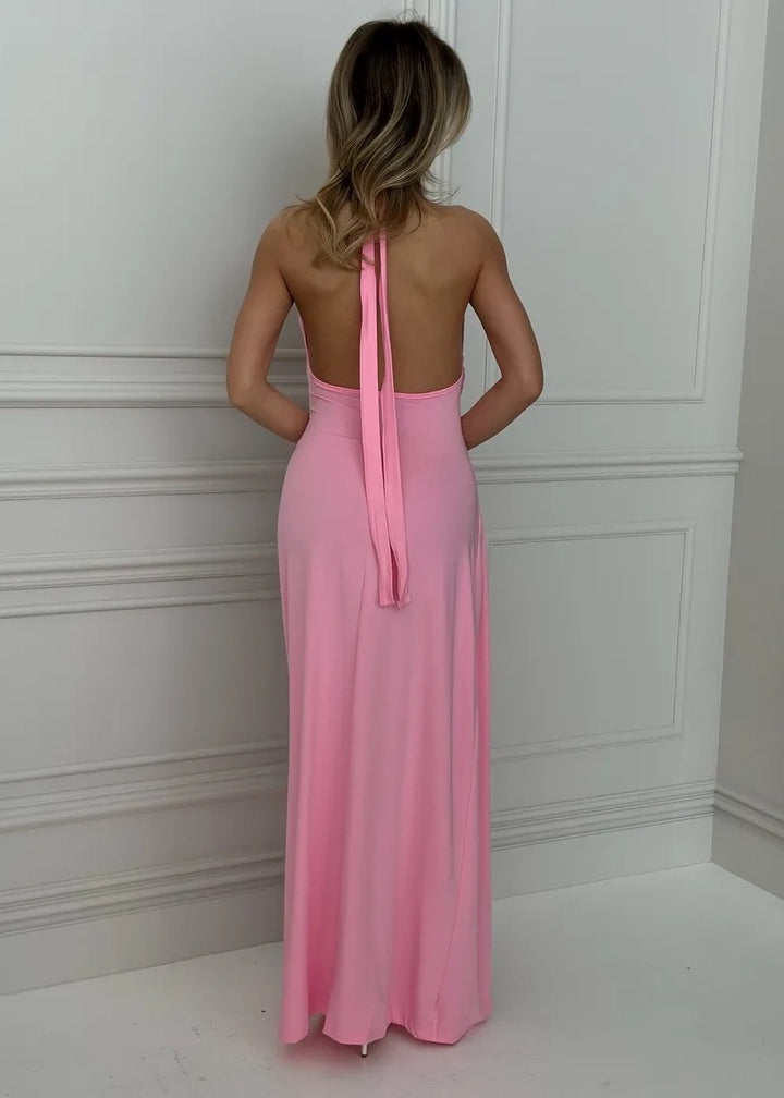 Introducing the Halter Neck Ruched Side Slit Maxi Dress, a captivating piece that seamlessly blends elegance with allure. This dress features a flattering halter neck design and a deep V neckline, accentuating the shoulders and collarbone. The ruched detailing not only enhances the silhouette but also adds texture, while a daring side slit allows for ease of movement and a touch of drama, making it perfect for special occasions or evening events.