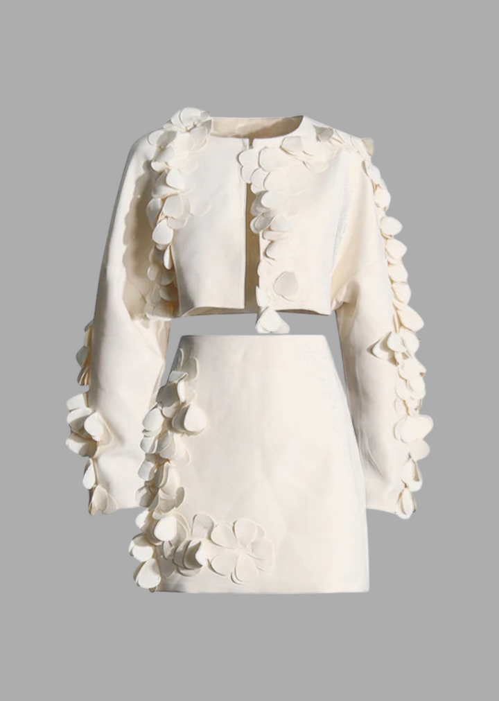 This two-piece set is a stunning fusion of modern design and artistic flair, perfect for making a sophisticated and unique statement. The set includes a cropped jacket and a matching mini skirt, both crafted from a sleek, structured fabric. The jacket features a cropped, boxy silhouette with a round neckline and a clean front opening. The standout element of the set is the abundance of three-dimensional fabric petal appliques. These are meticulously placed on the long sleeves of the jacket and cascade down the sides of the high-waisted mini skirt. The appliques add a sculptural, textural quality to the ensemble, creating a dynamic and art-inspired look. The mini skirt features a sleek, form-fitting silhouette that is balanced by the playful, voluminous appliques.