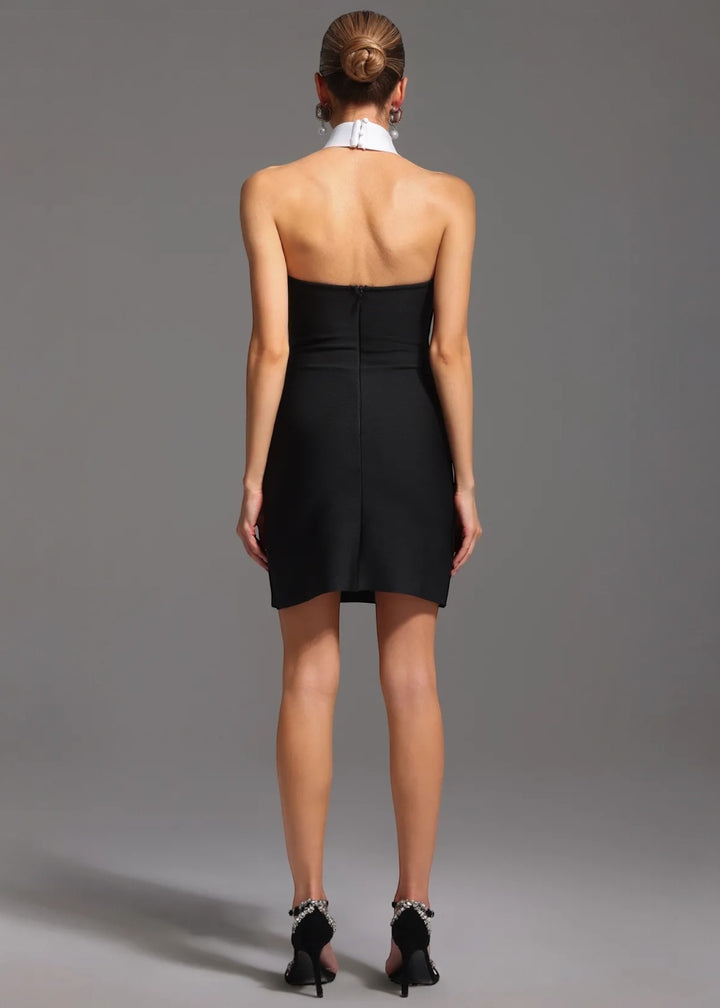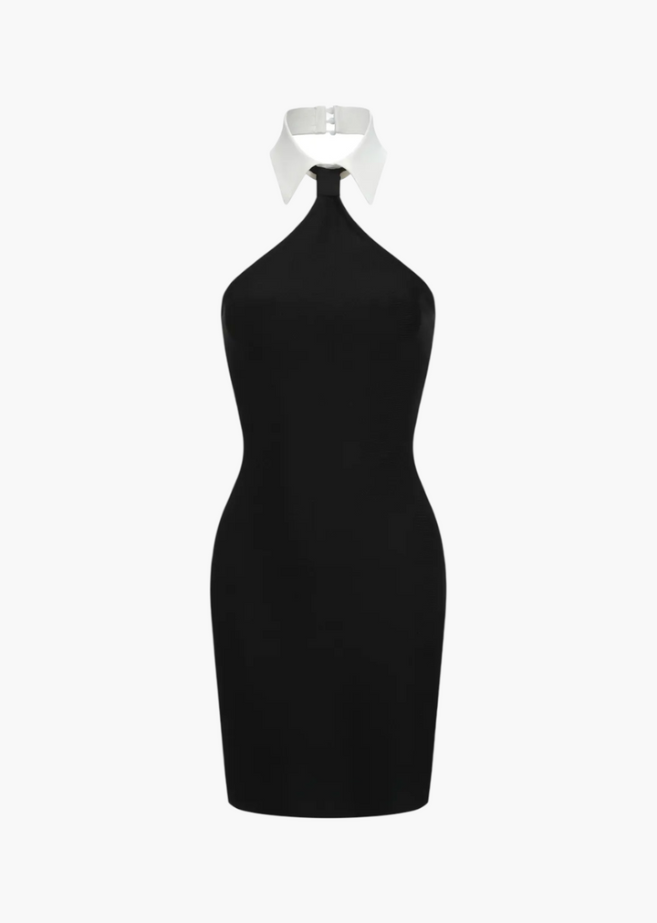 This mini dress offers a unique and sophisticated design, blending a sleek silhouette with an unexpected detail. It features a halter neckline with a distinct, attached collar that fastens at the back, creating a bold and structured look. The dress has a mini length and a bodycon fit, designed to contour the figure. The material has a subtle texture, adding depth to the otherwise smooth design. A concealed zipper at the back ensures a seamless and secure fit. This dress is a standout choice for any event where you want to make a stylish and modern statement.