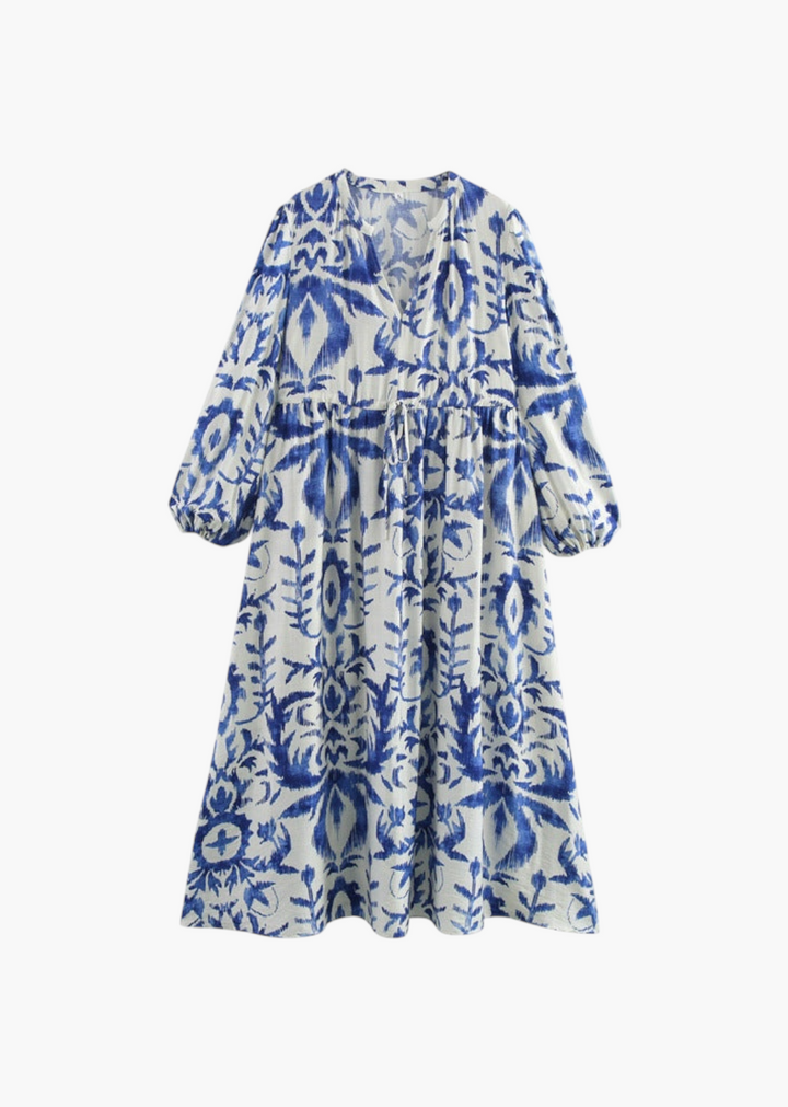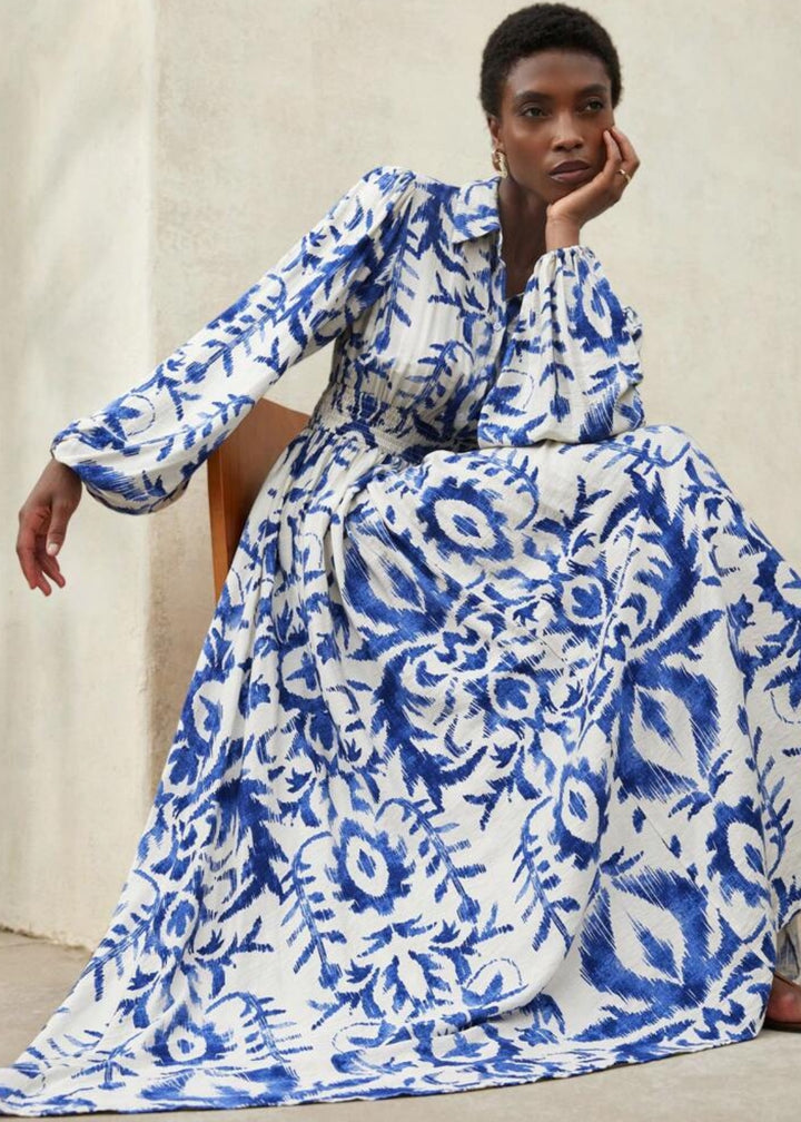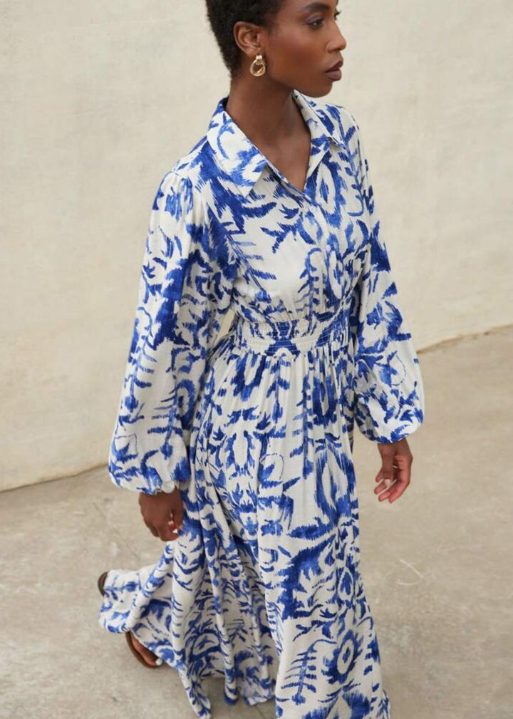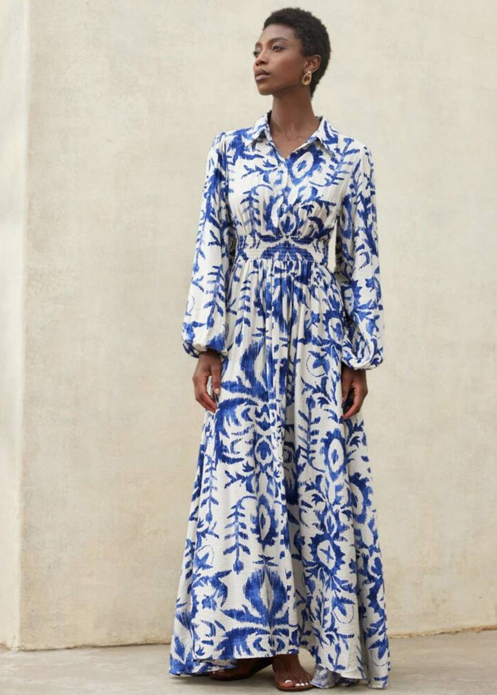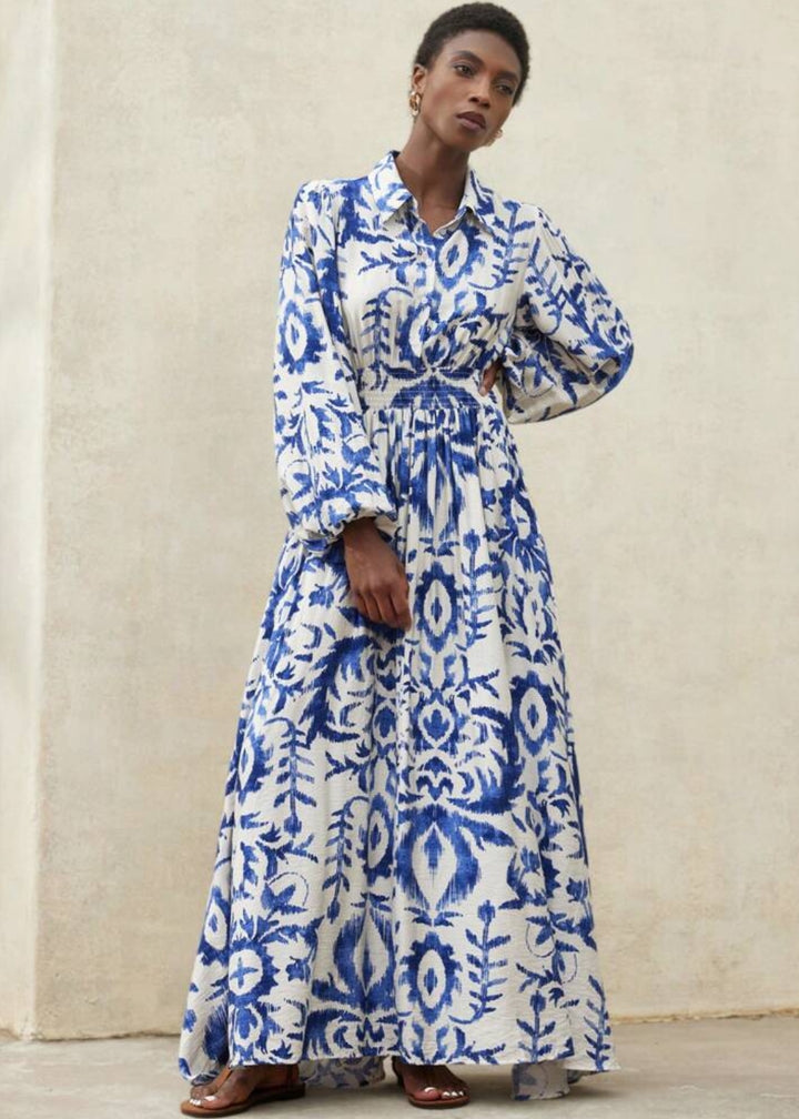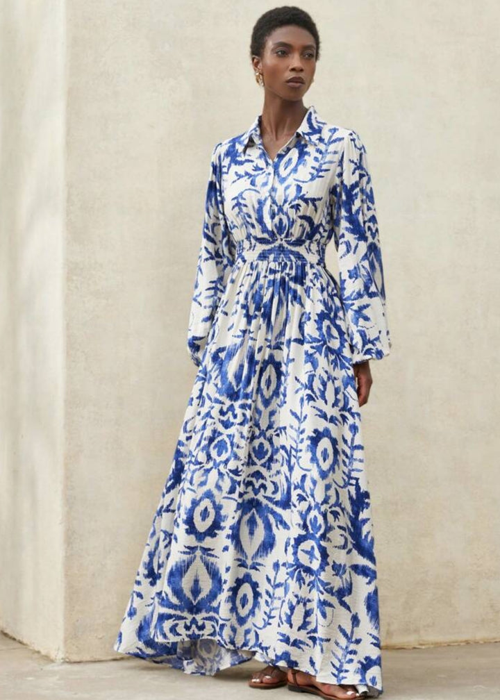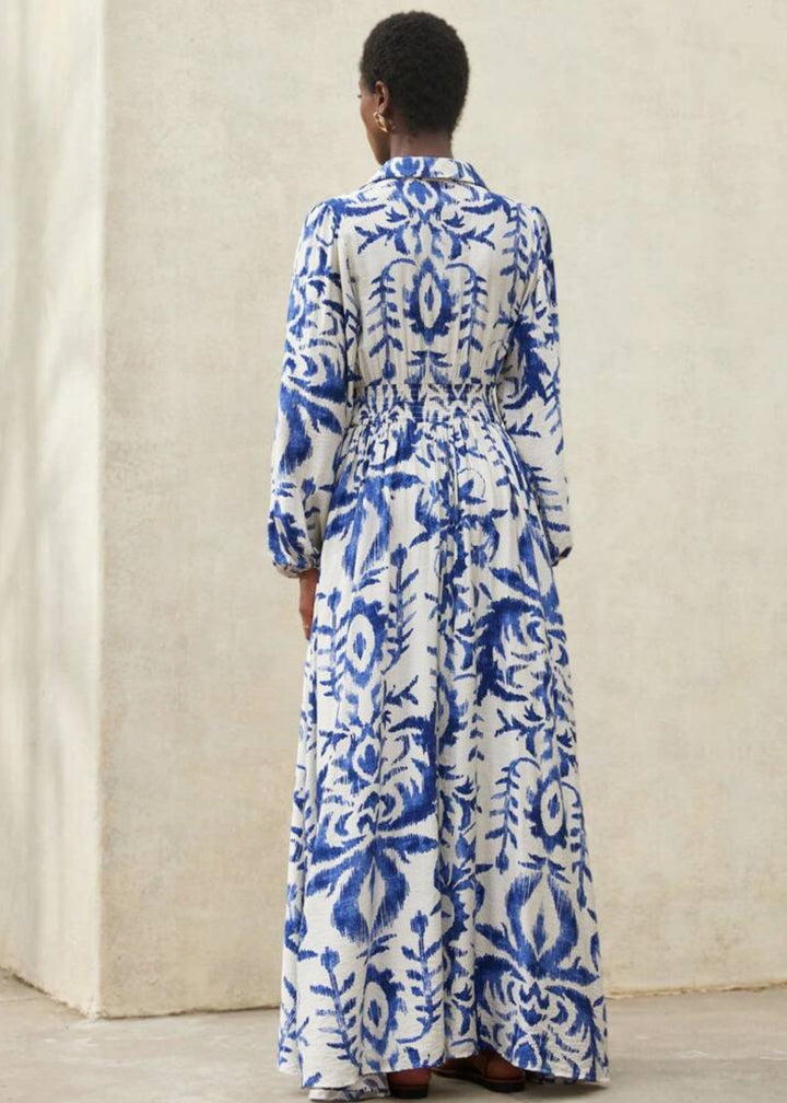 This breezy long-sleeve maxi dress features an abstract ikat-inspired print and timeless shirt-dress detailing. With a collared neckline, full-length silhouette, and soft gathered waist, it offers a flattering fit for both casual days and elevated occasions. Designed in lightweight fabric with a flowing hem, it moves effortlessly with every step. Pair it with leather sandals and minimal jewelry for a polished daytime look, or add a wide-brim hat for a refined vacation aesthetic.