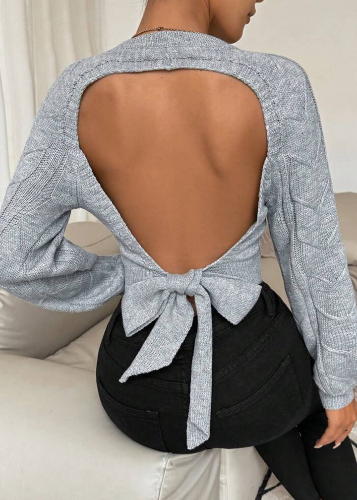 Expertly crafted with a cozy cable knit, this crop sweater is a must-have for any fashionable wardrobe. Featuring a unique cutout back and bow tie detail, this gray sweater exudes effortless style. Its long sleeves provide warmth, making it perfect for cooler days. Elevate your look with this chic and versatile piece.