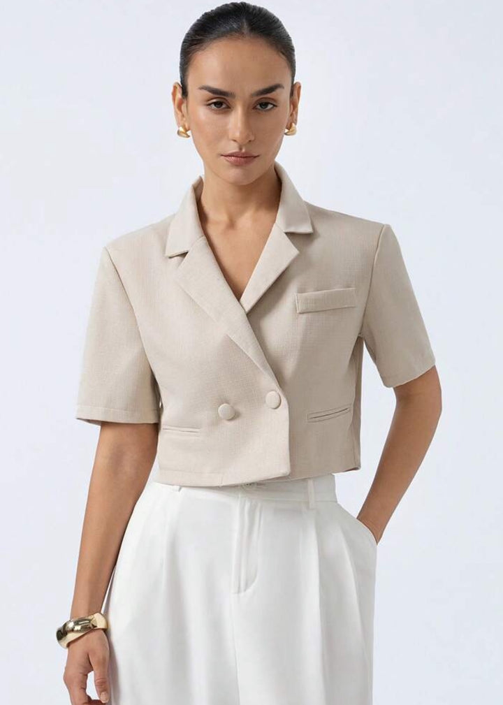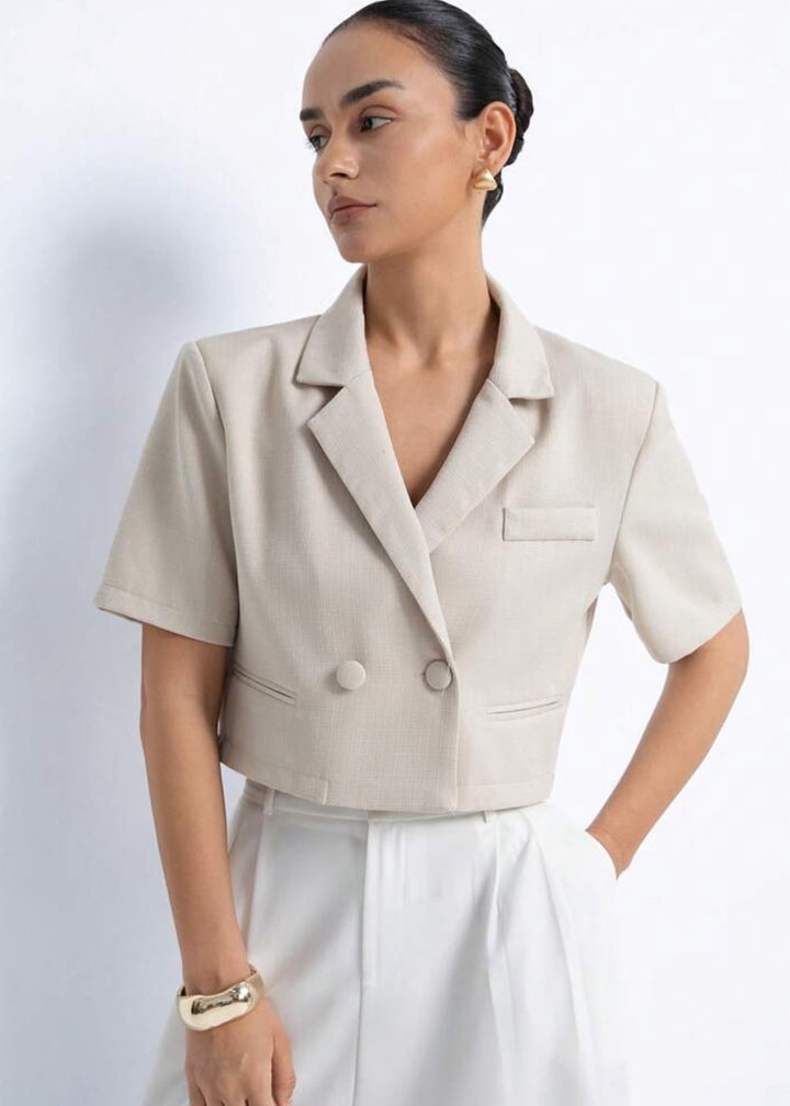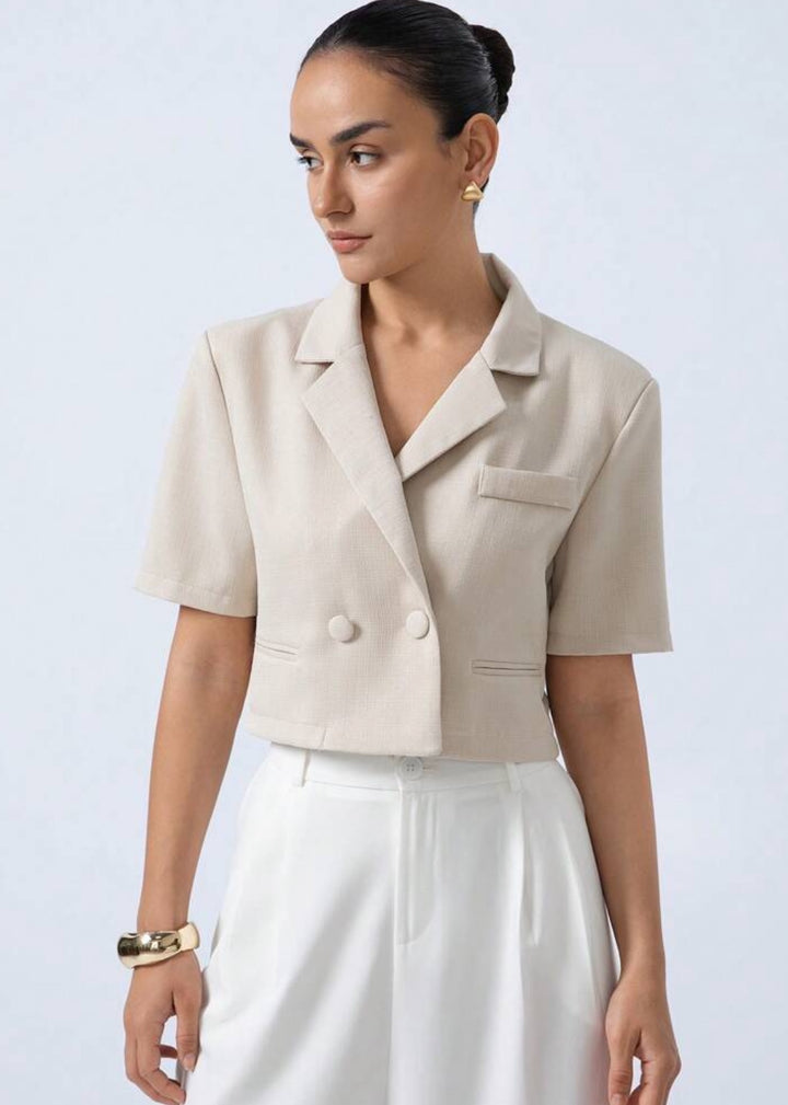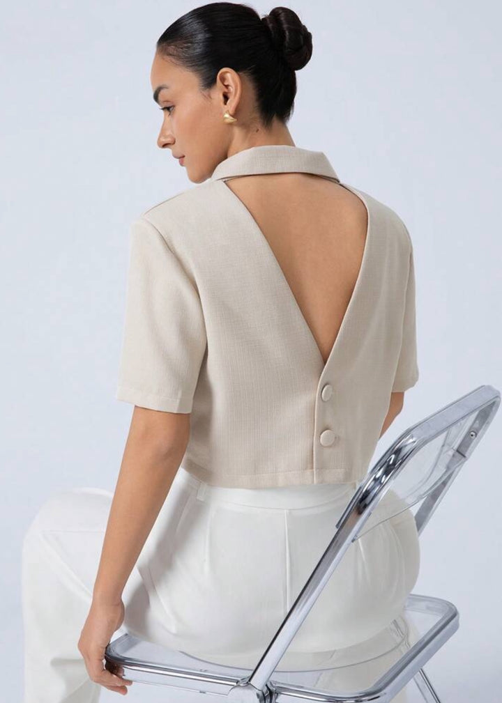 This top is a unique and contemporary piece that merges the structure of a blazer with the style of a top. It features a cropped length, a sophisticated V-neckline, and a classic double-breasted button front. The back is designed with a striking open V-cut, adding an unexpected and modern touch, while the short sleeves with shoulder pads give it a polished, structured silhouette.