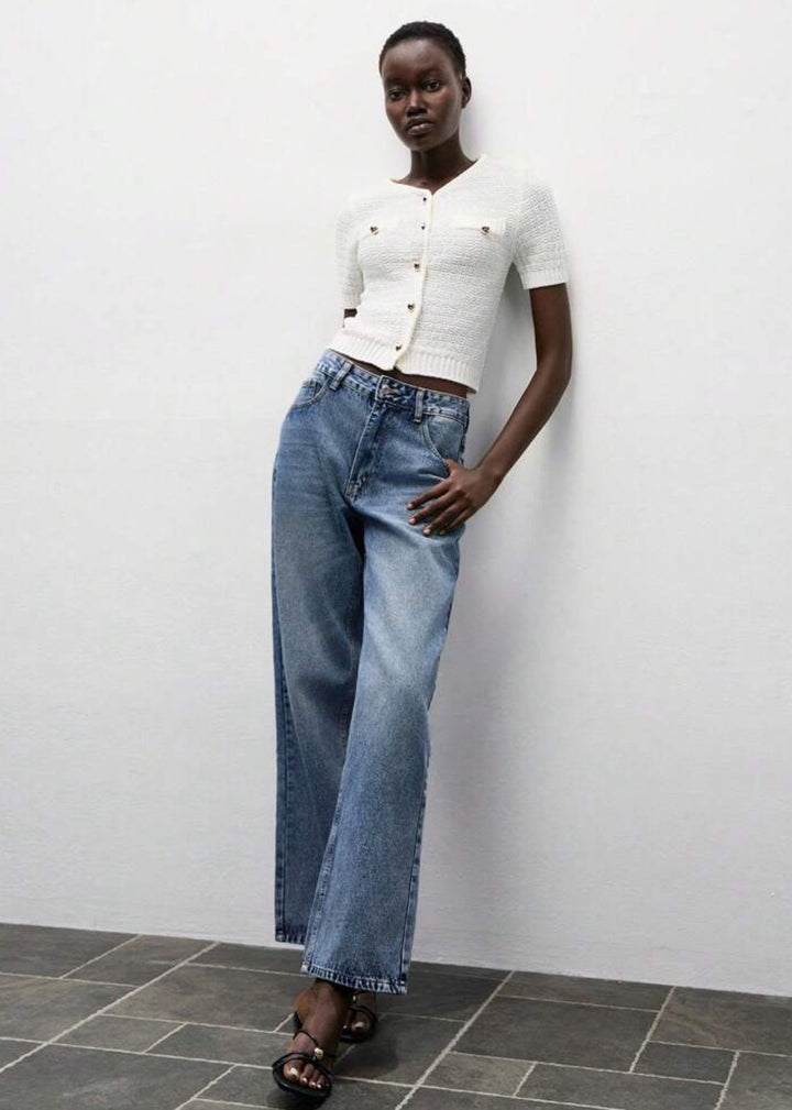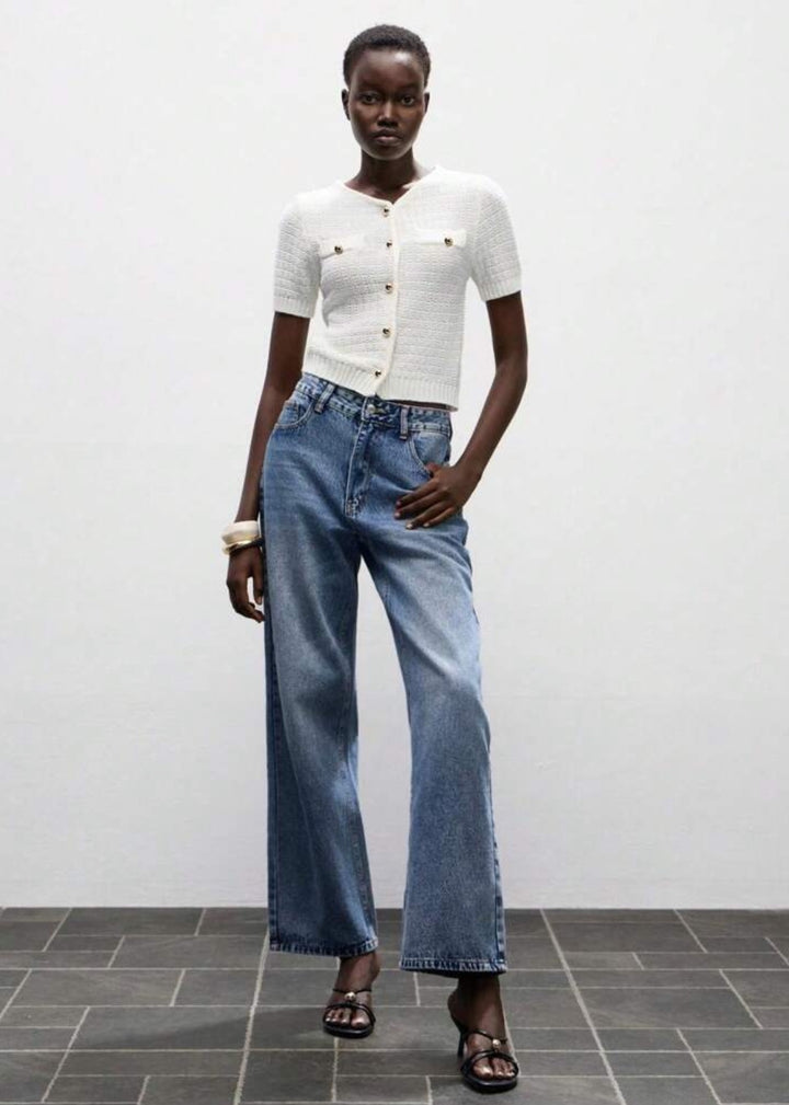 Pair with high-waisted jeans for a casual yet refined look. For a more professional setting, wear it buttoned up with a pencil skirt or tailored trousers. Add simple gold jewelry to complement the buttons and complete the outfit.