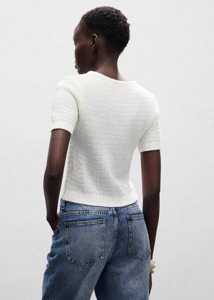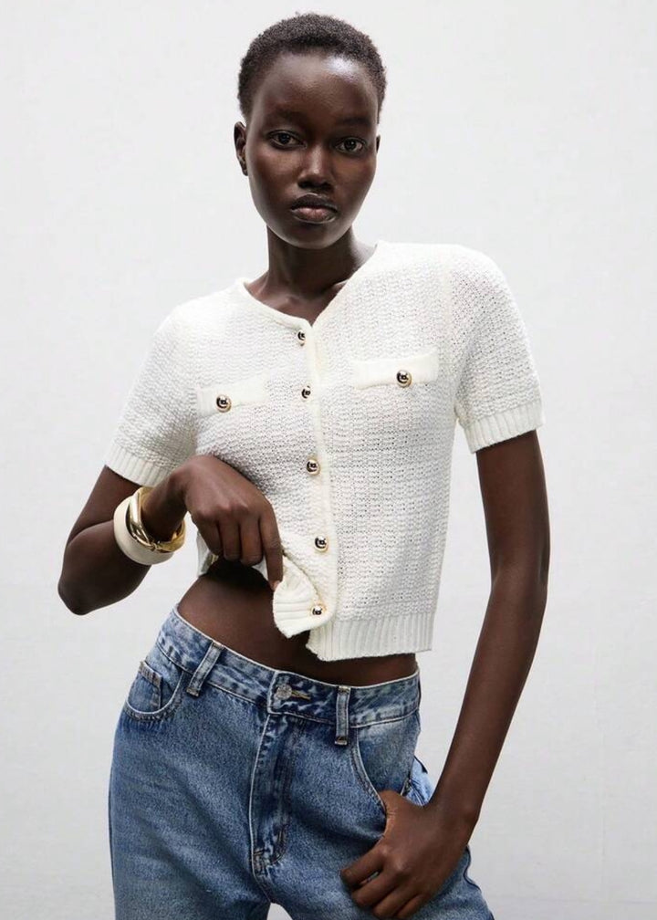 This classic short sleeve top combines the comfort of a sweater with the structure of a blouse. It features a crew neckline and a full button-front closure, accented with gold-tone buttons. The textured knit fabric is complemented by two small patch pockets at the bust, each with a decorative flap and a matching gold-tone button.