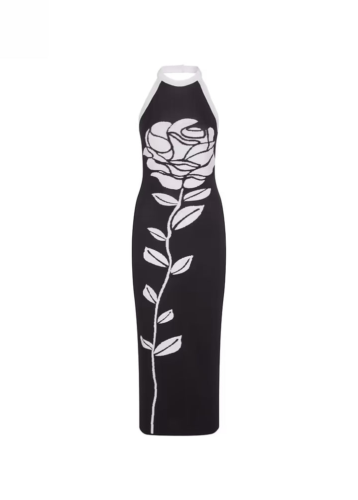 This dress is a modern take on timeless elegance, designed to create a striking and sophisticated silhouette. The dress features a sleek halter neckline with a contrasting trim that frames the décolletage and shoulders. The bodycon fit hugs the figure, extending to a midi length. A bold floral motif is embroidered on the front, with a large bloom at the chest and a stem with leaves trailing down the body. This intricate detail adds an artistic flair and serves as the dress's central focus. The back is a clean, open design with a long zipper closure, providing both a secure fit and a sleek line. This dress is an excellent choice for cocktail parties, dinner events, and sophisticated gatherings where you want to stand out with a confident and stylish look.