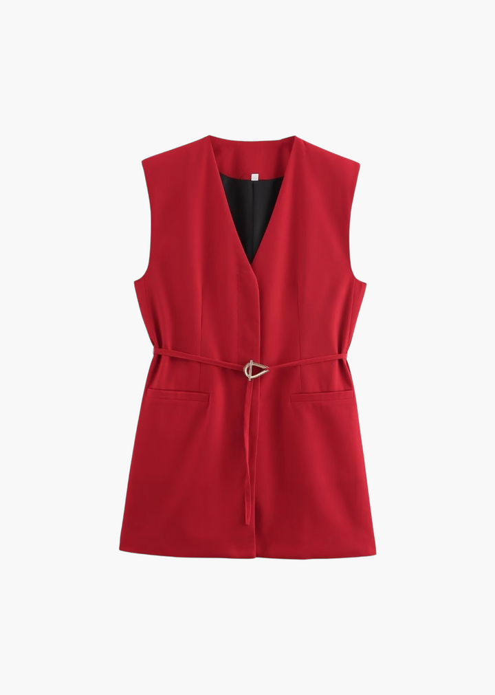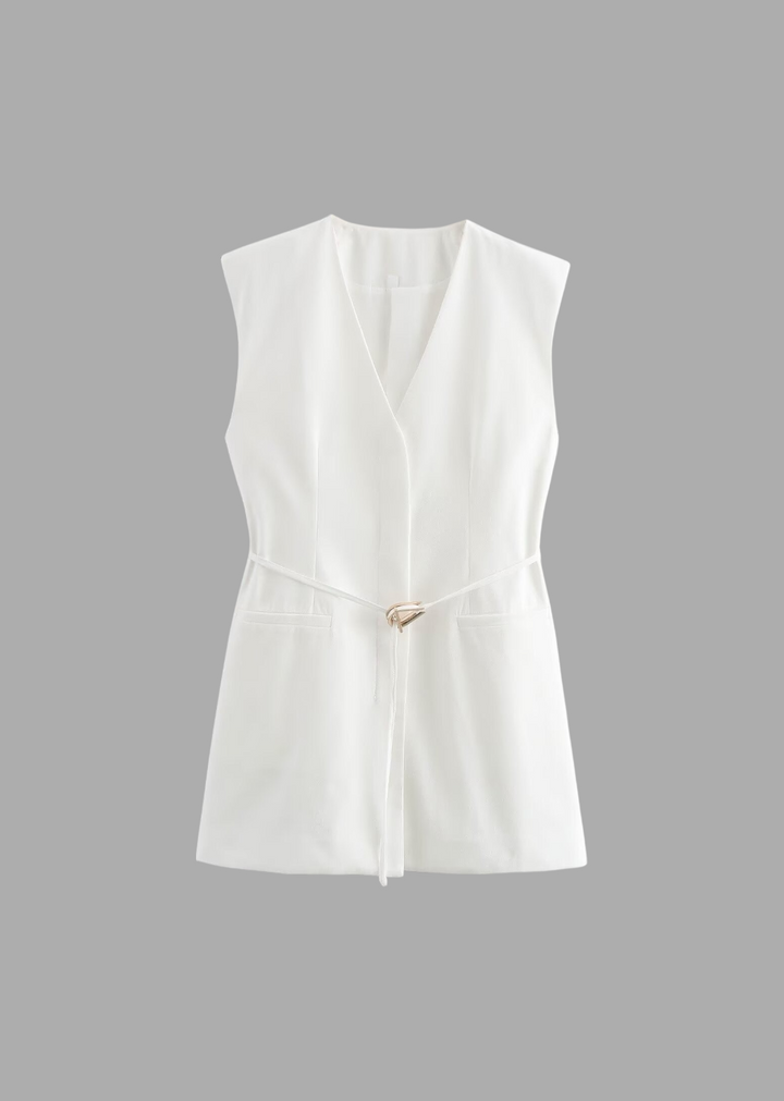 This vest is a sleek and contemporary piece, featuring a sophisticated V-neckline and sleeveless design that exudes modern elegance. It comes with a coordinating belt that cinches the waist, creating a flattering silhouette, and practical front pockets for added functionality and style. Crafted for versatility, this vest can be dressed up or down, making it an essential addition to any wardrobe.
