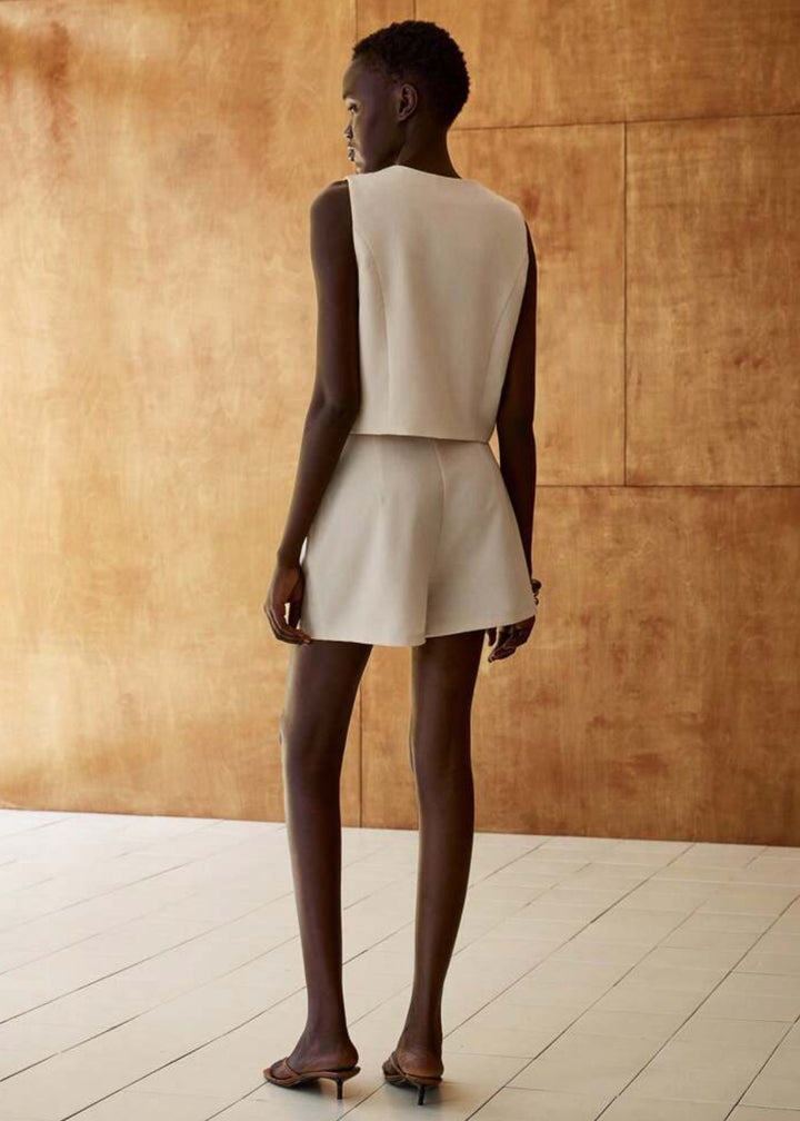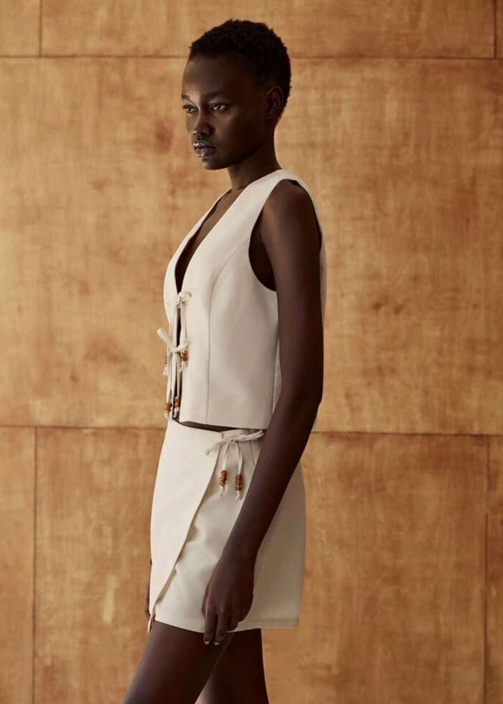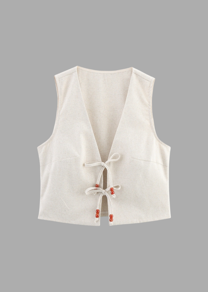 This sleeveless crop top features a V-neckline with a distinctive tie-front closure, adorned with decorative beads. The garment offers a cropped length, making it ideal for pairing with high-waisted bottoms. Crafted from a smooth,substantial fabric, it provides a structured yet comfortable fit.