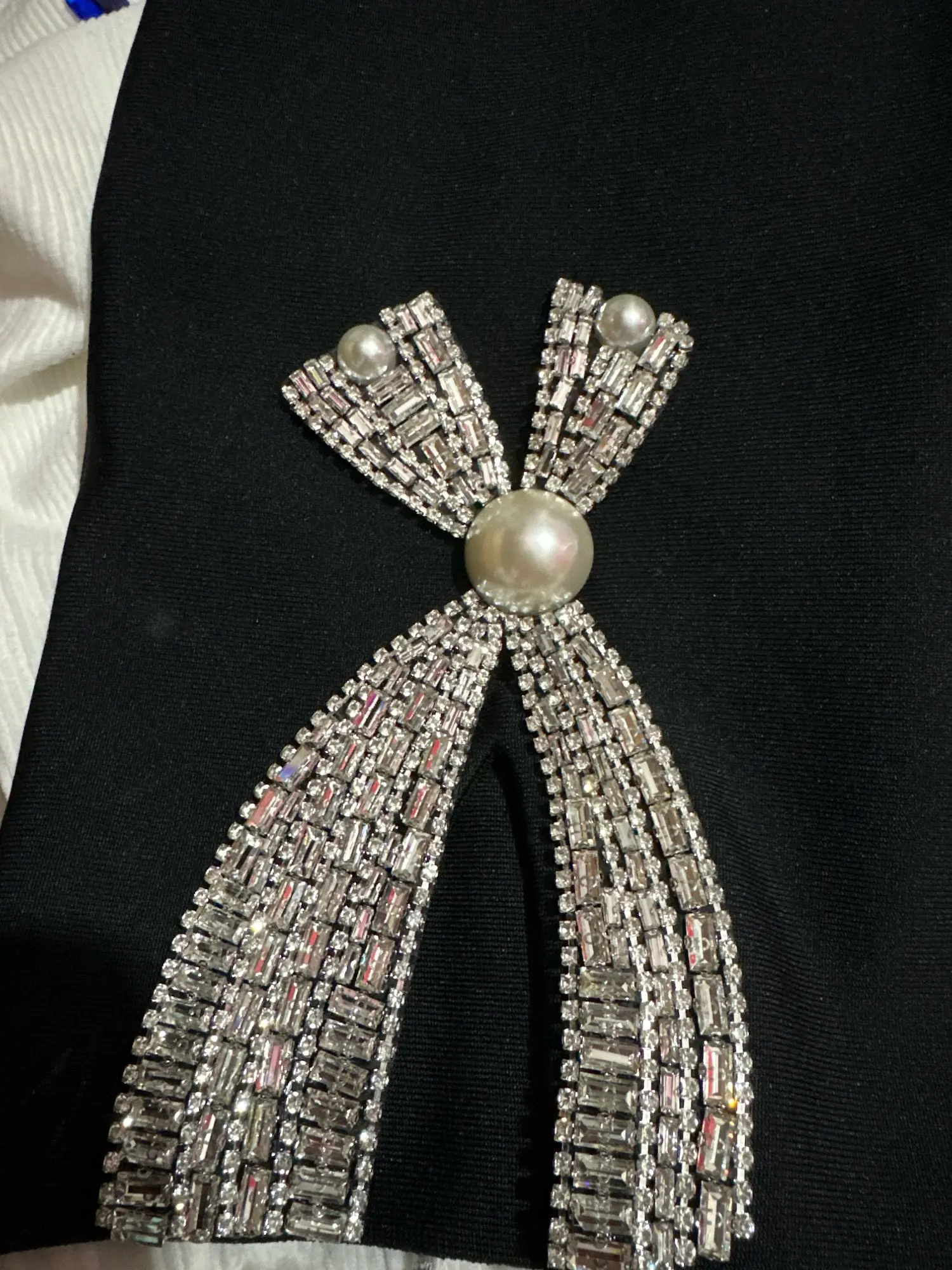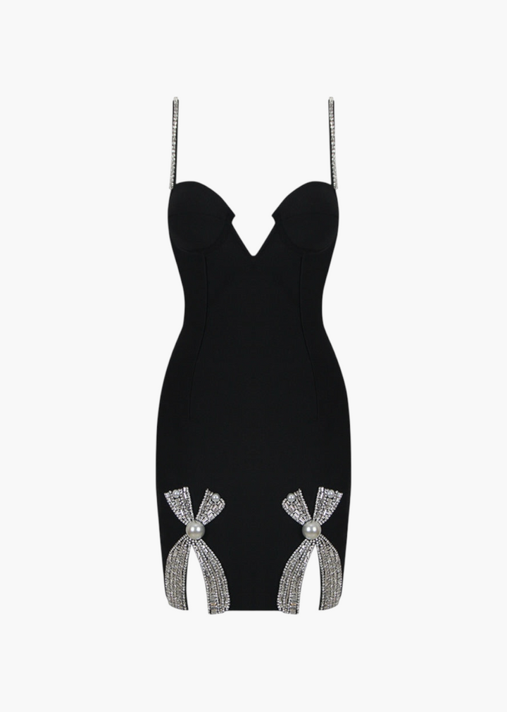 This mini dress features a sweetheart neckline and a form-fitting silhouette that hugs the body. The dress is designed with rhinestone and faux pearl embellished straps and bow details at the hem. The structured bustier bodice adds a touch of elegance, while the hemline details create a playful and eye-catching finish. The dress is secured with a zipper closure at the back.