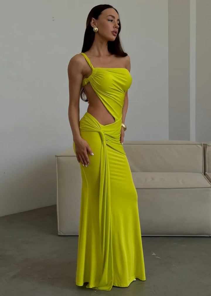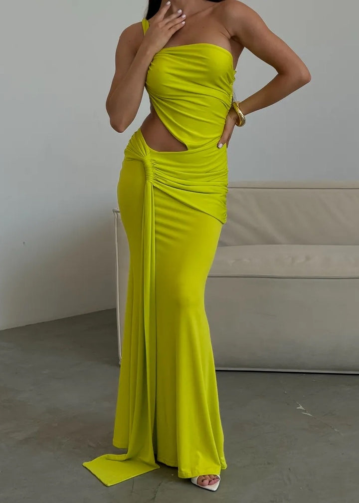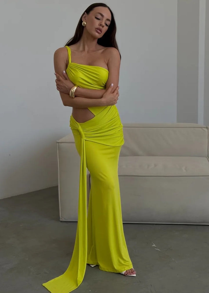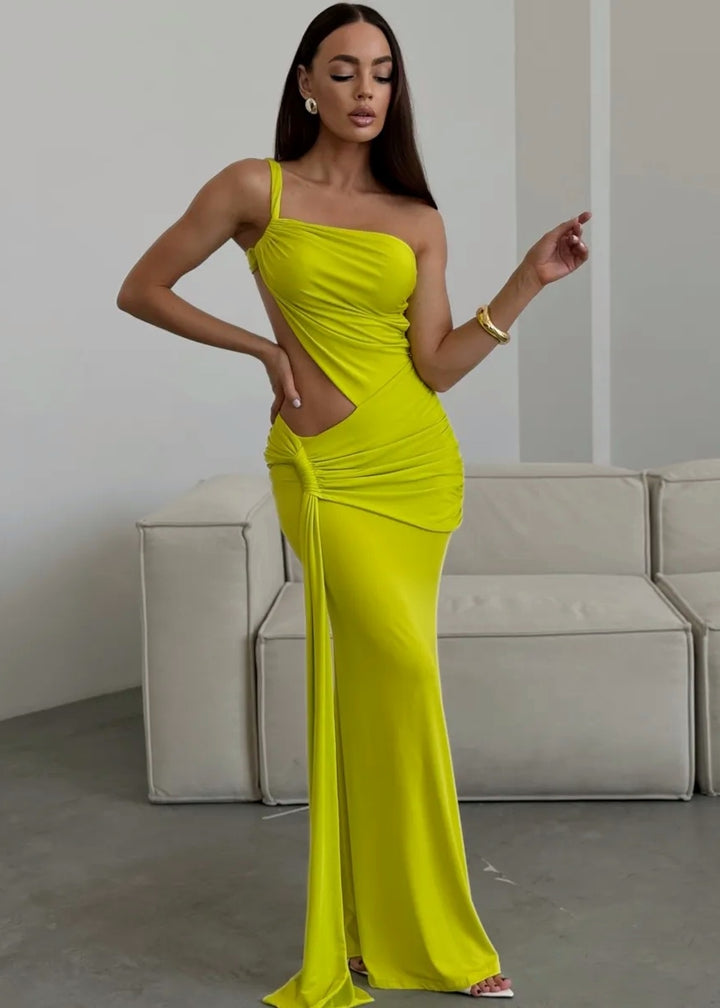 Introducing the One Shoulder Ruched Side Cutout Maxi Dress, a stunning addition to any wardrobe designed for special occasions. This dress features a unique one-shoulder design that elegantly highlights the collarbone, paired with a stylish ruched detail that flatters the figure. The side cutout adds a bold touch, creating an alluring silhouette while maintaining sophistication.