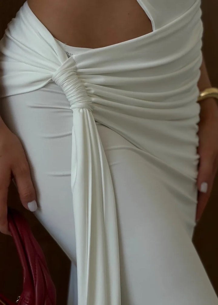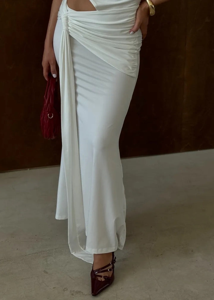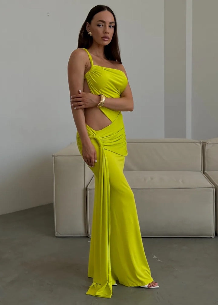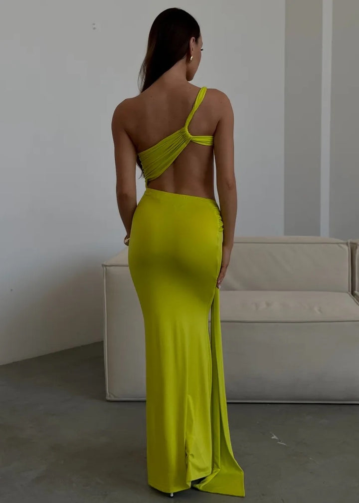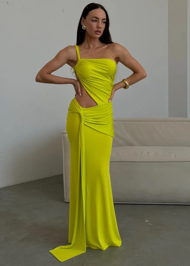 Introducing the One Shoulder Ruched Side Cutout Maxi Dress, a stunning addition to any wardrobe designed for special occasions. This dress features a unique one-shoulder design that elegantly highlights the collarbone, paired with a stylish ruched detail that flatters the figure. The side cutout adds a bold touch, creating an alluring silhouette while maintaining sophistication.