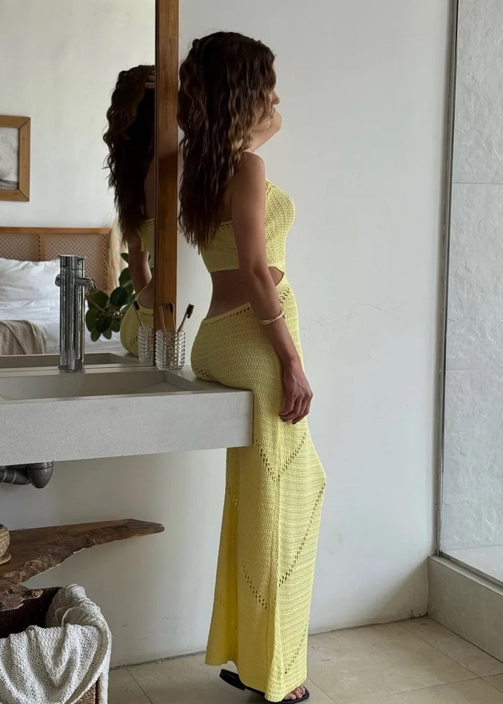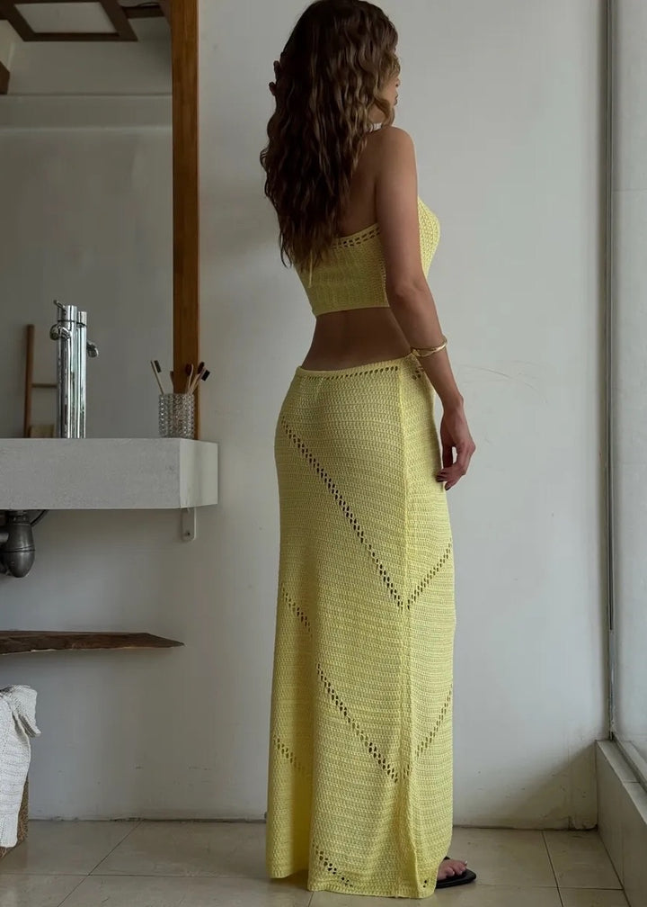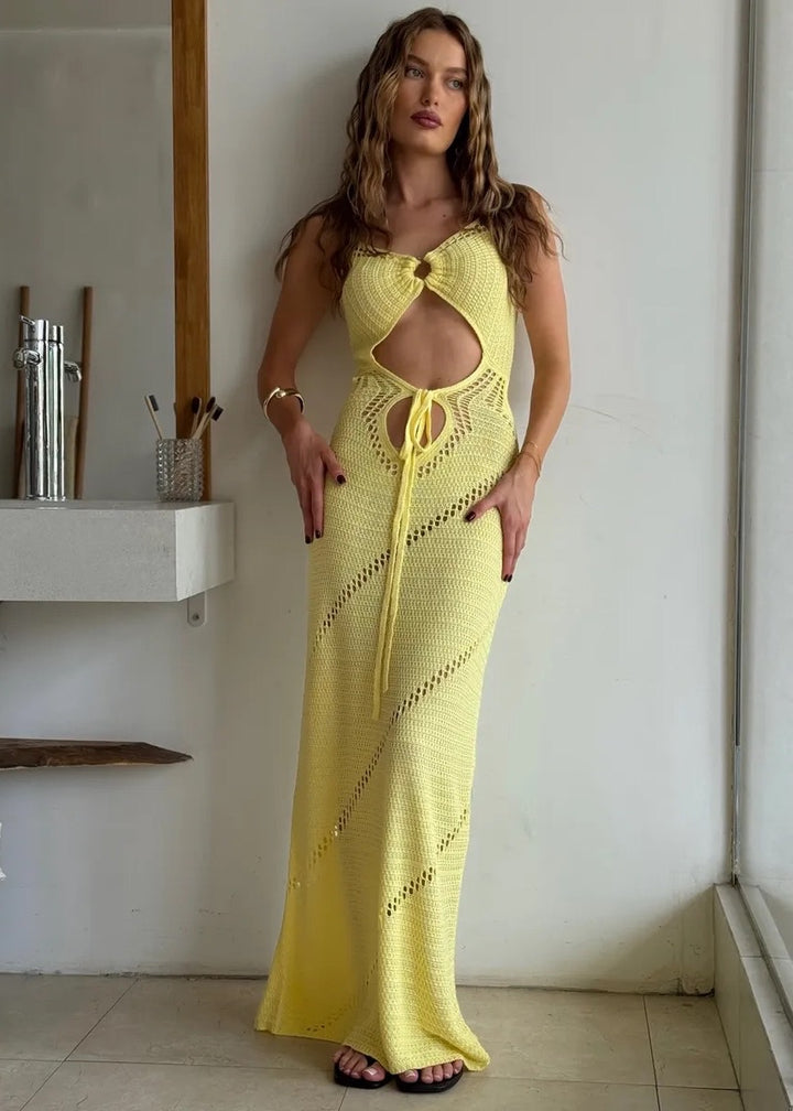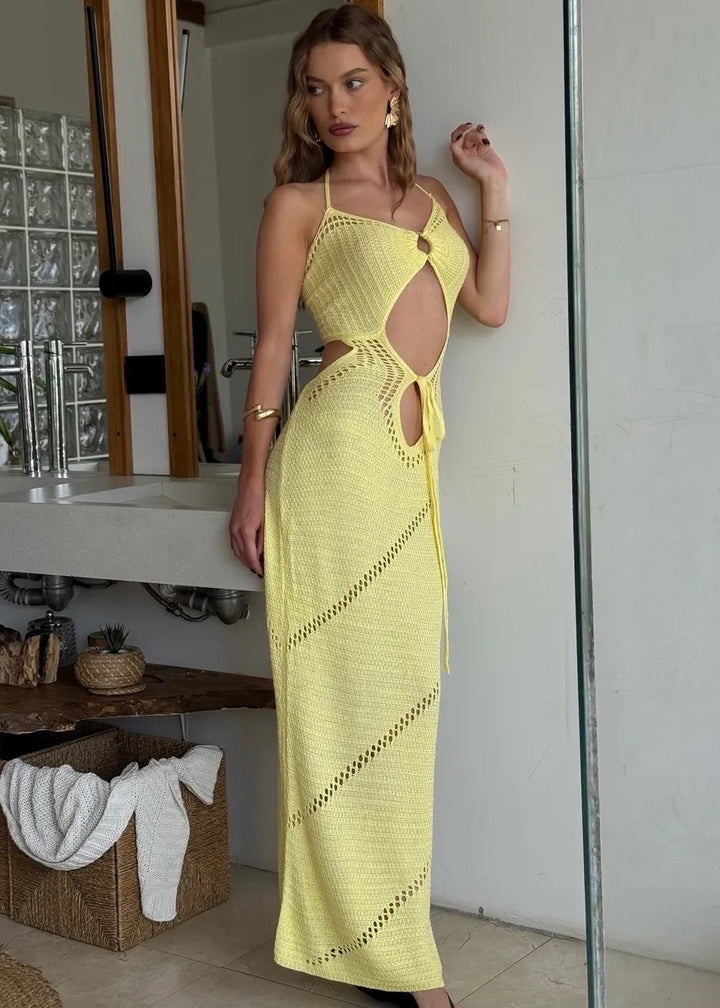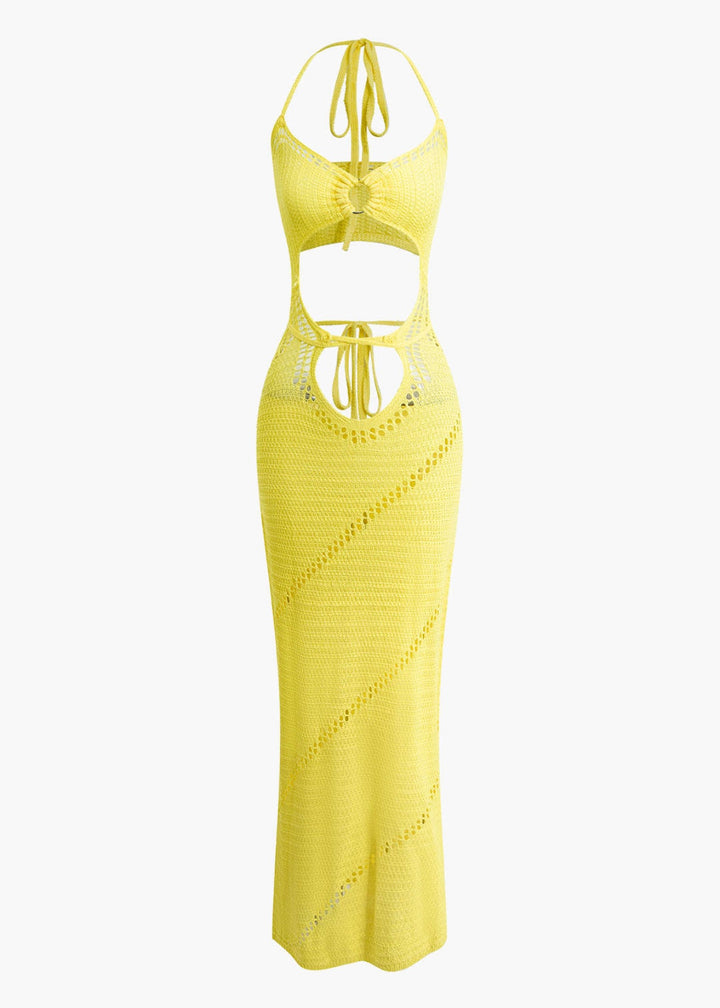 Introducing the Open Knit Halter Maxi Dress with Side Cutouts, a stunning piece designed for those who appreciate unique styles. This dress features a captivating open-knit pattern, allowing for breathability and a touch of elegance. The halter neckline provides a flattering silhouette, complemented by a distinctive circular cutout at the bust. A tie closure at the waist allows for adjustable fit, enhancing your natural shape while offering comfort.