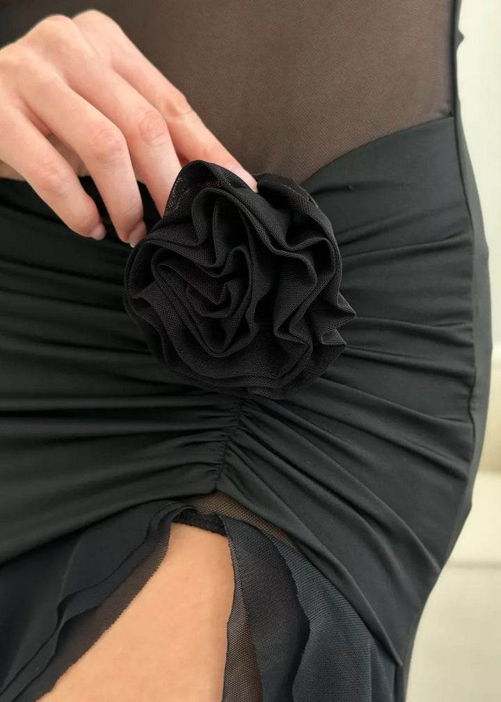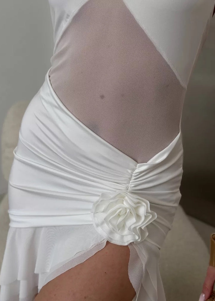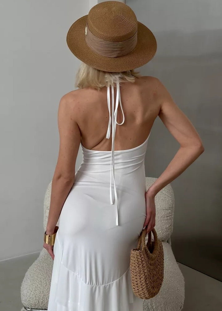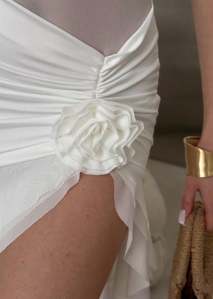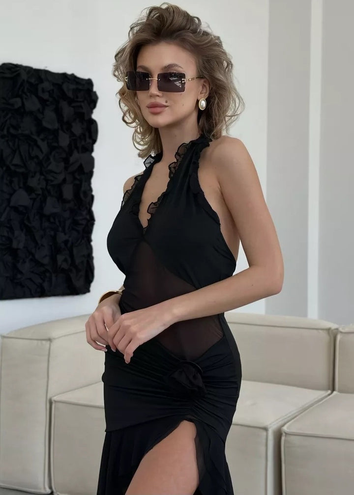 Introducing the Ruffled Halter Neck Dress with Floral Accent, a stunning blend of sophistication and allure. This dress features a unique halter neckline that elegantly frames the shoulders, paired with a daring open back for an eye-catching detail. The soft, flowing fabric drapes beautifully, creating a flattering silhouette with a high slit that adds a touch of drama.