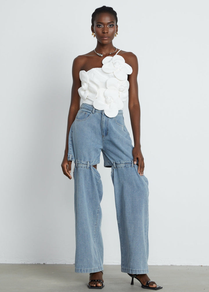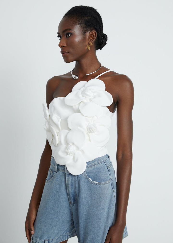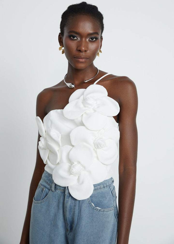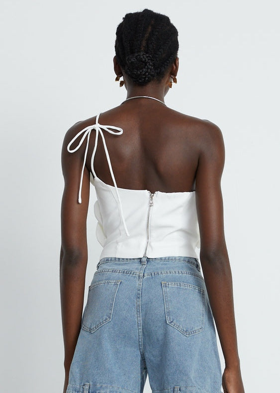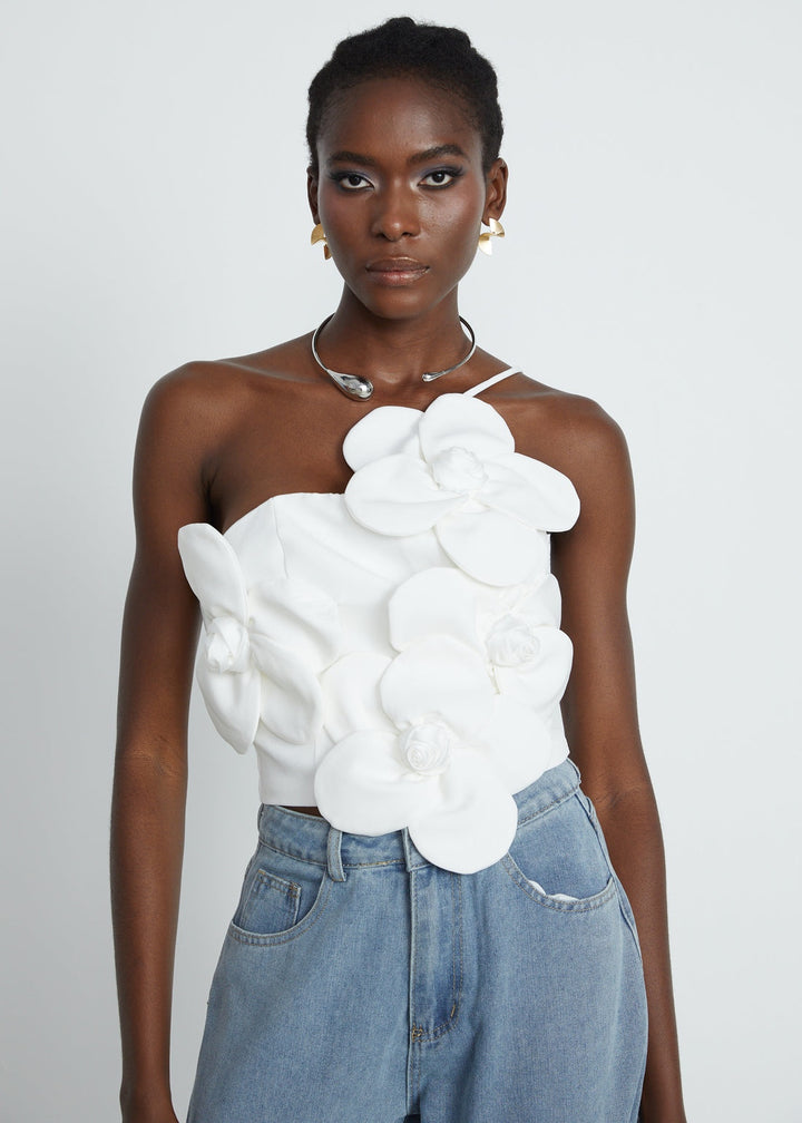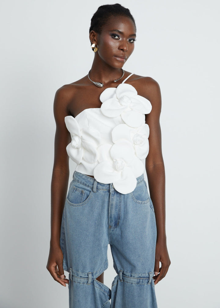 This statement top features a unique one-shoulder silhouette, creating an asymmetric and modern design. The bodice is embellished with three-dimensional floral appliques, adding texture and visual interest. A delicate tie closure at the single shoulder allows for adjustable styling and adds a charming detail. The top has a fitted shape that is cropped at the waist, making it ideal for pairing with high-waisted bottoms. A concealed zipper at the back ensures a smooth and secure fit. This top is perfect for adding a touch of elegance and flair to both casual and dressier outfits.