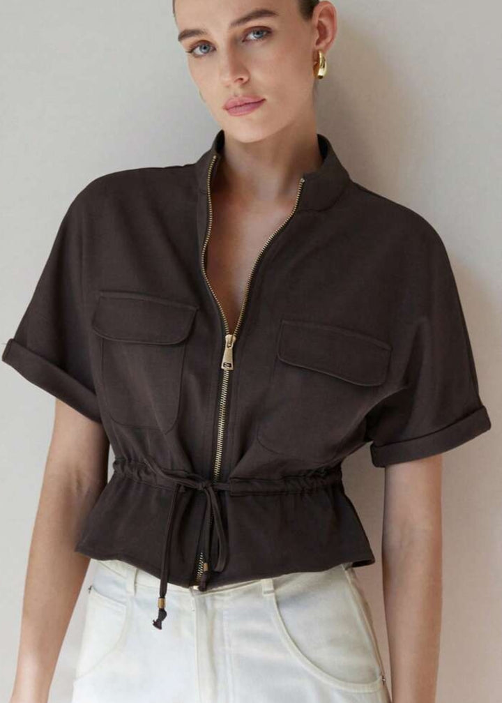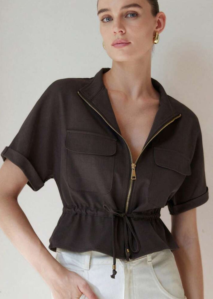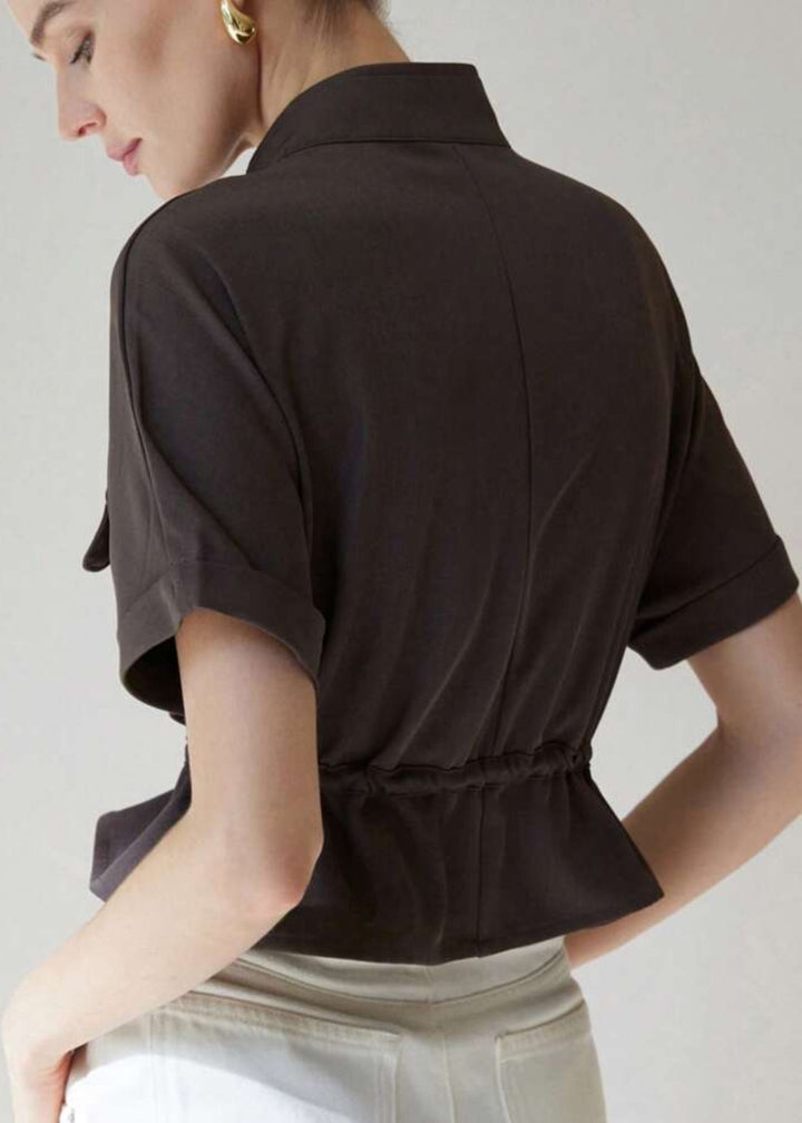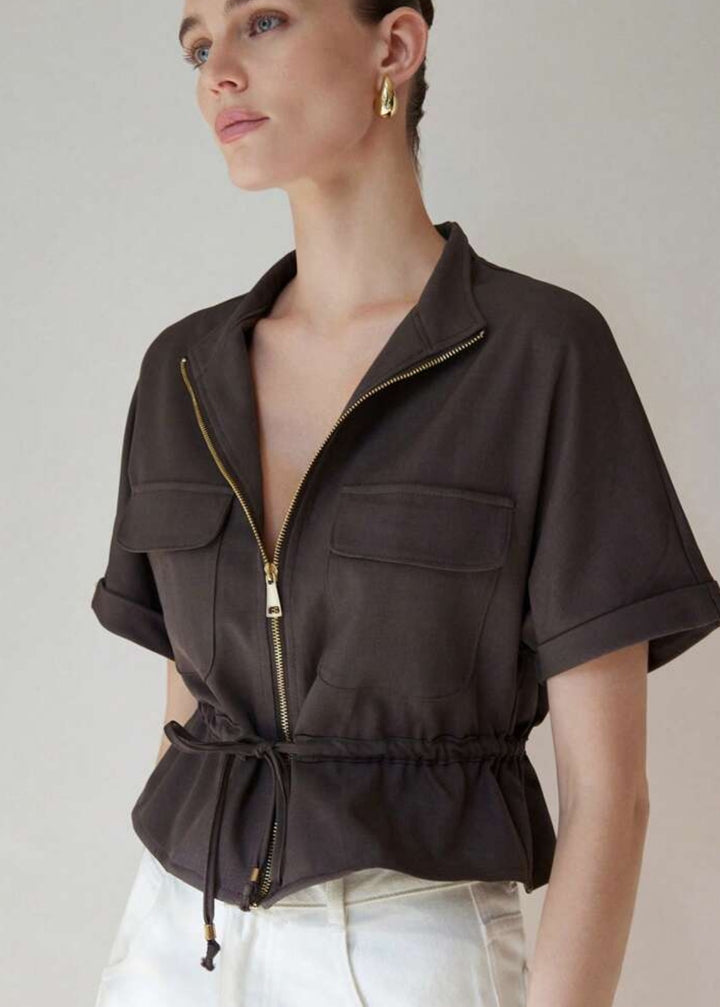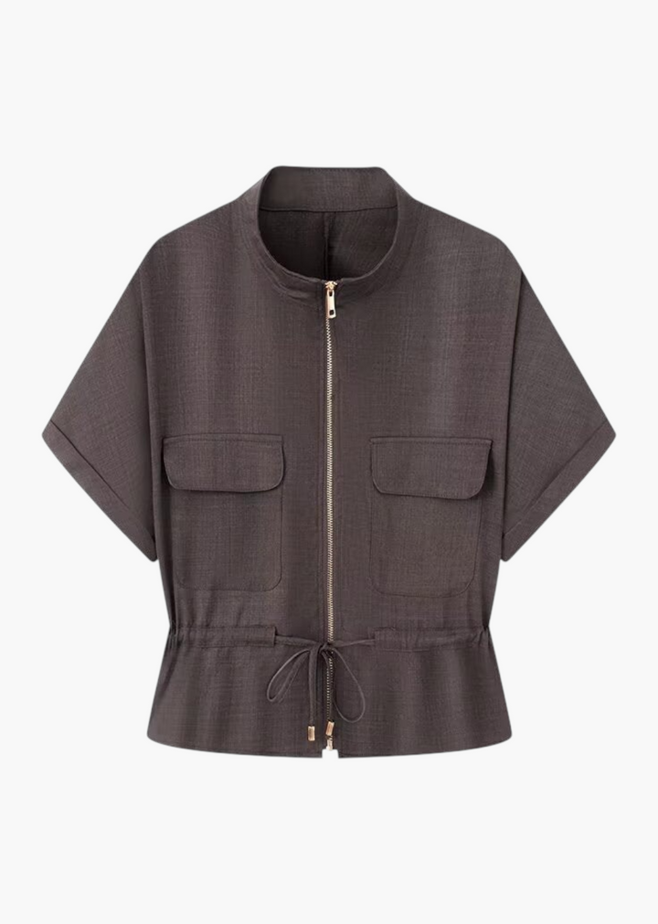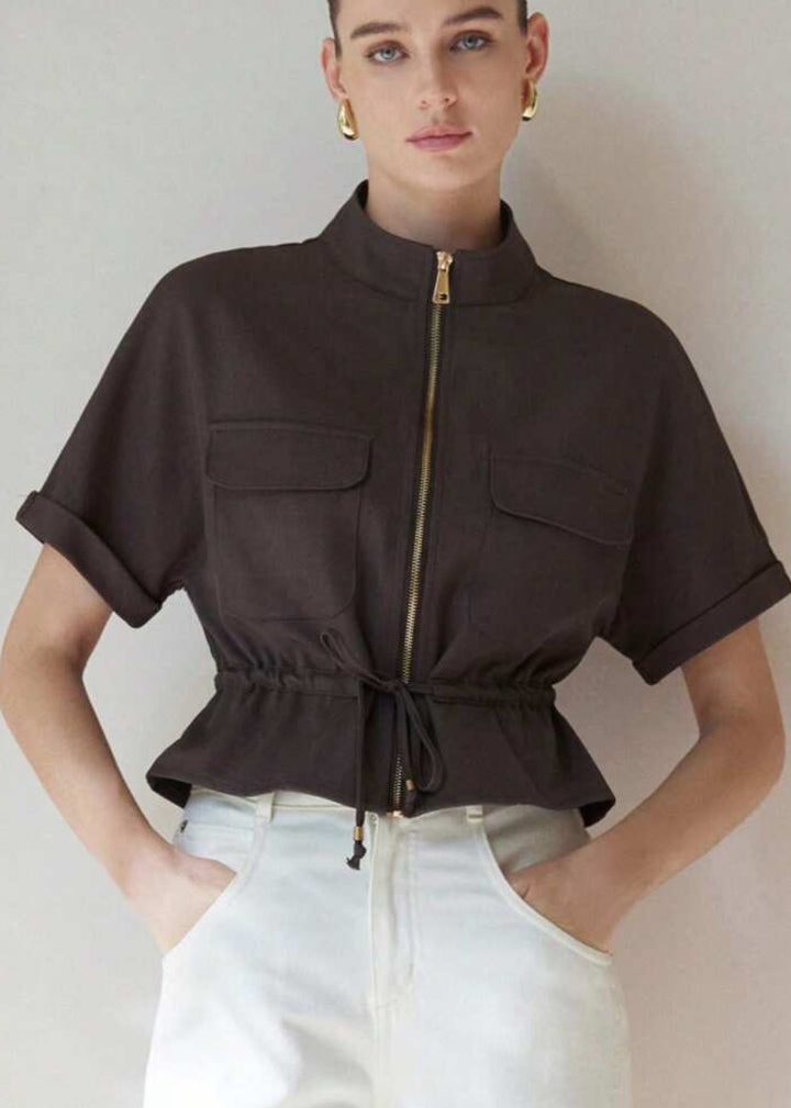 This top features a stand collar and a full front zip closure. It includes two chest pockets with flap details. The short sleeves are cuffed, and the waist is cinched with an adjustable drawstring, creating a flattering peplum-like silhouette.