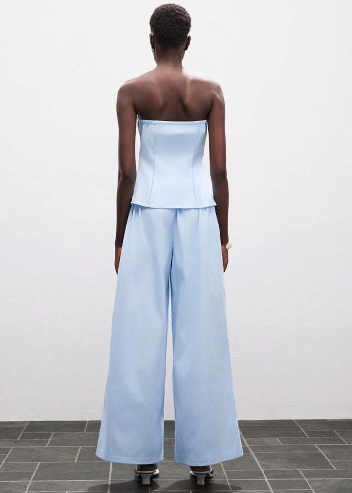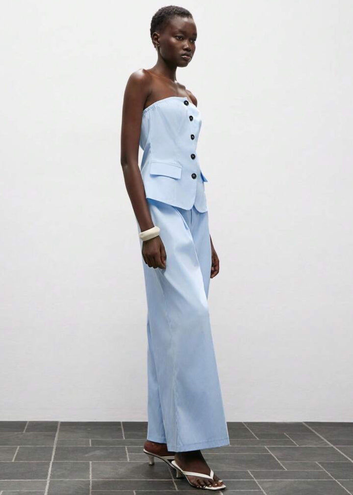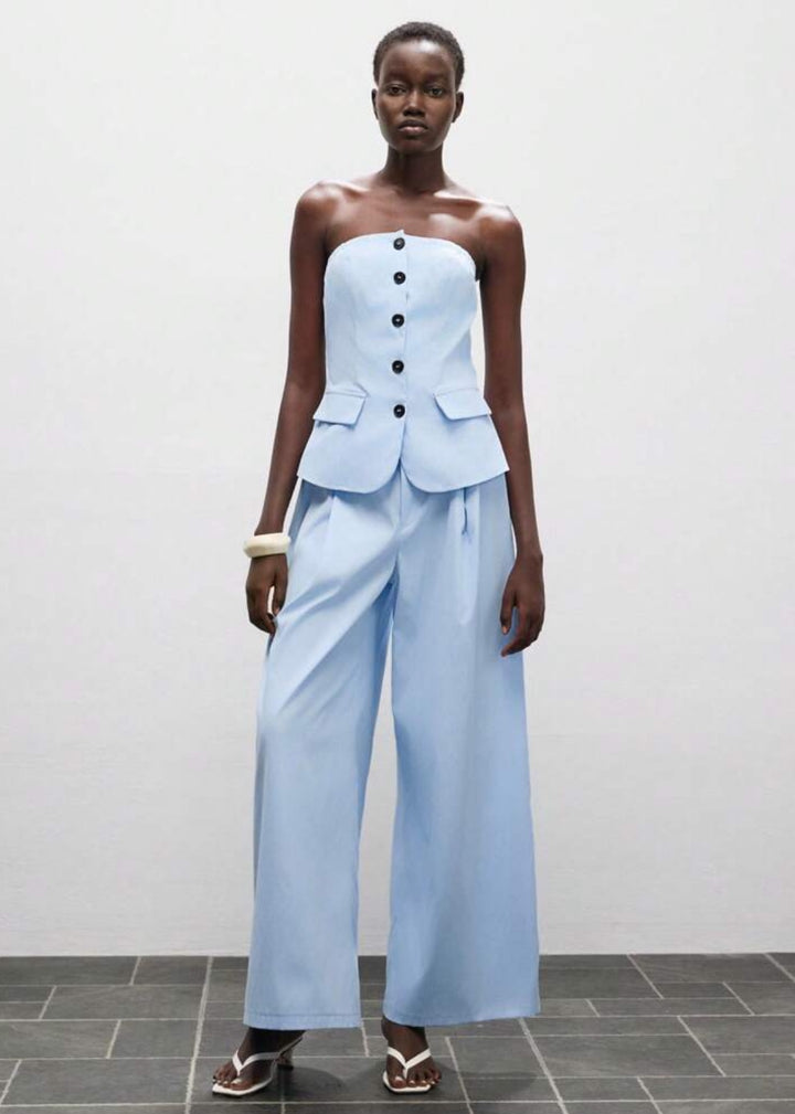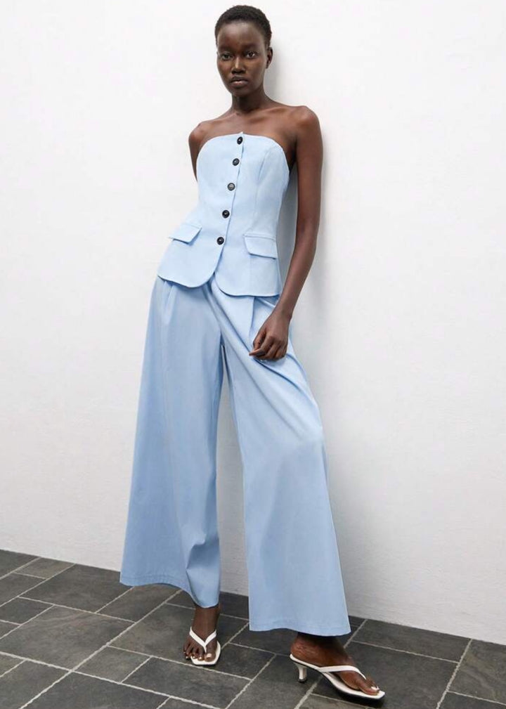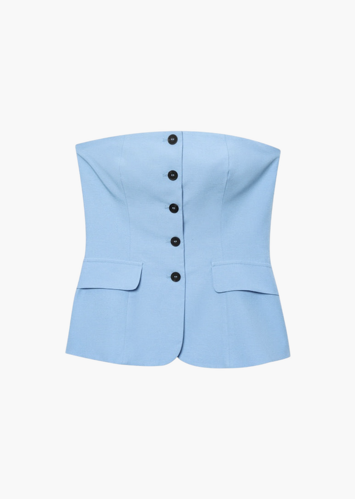 This strapless top features a flattering peplum hem and a button-front closure. It is designed with two decorative flap pockets at the waist, adding a touch of tailored detail. The top is made from a smooth fabric, offering a structured yet comfortable fit.