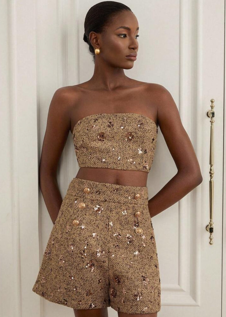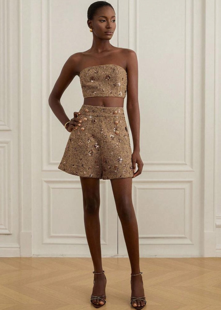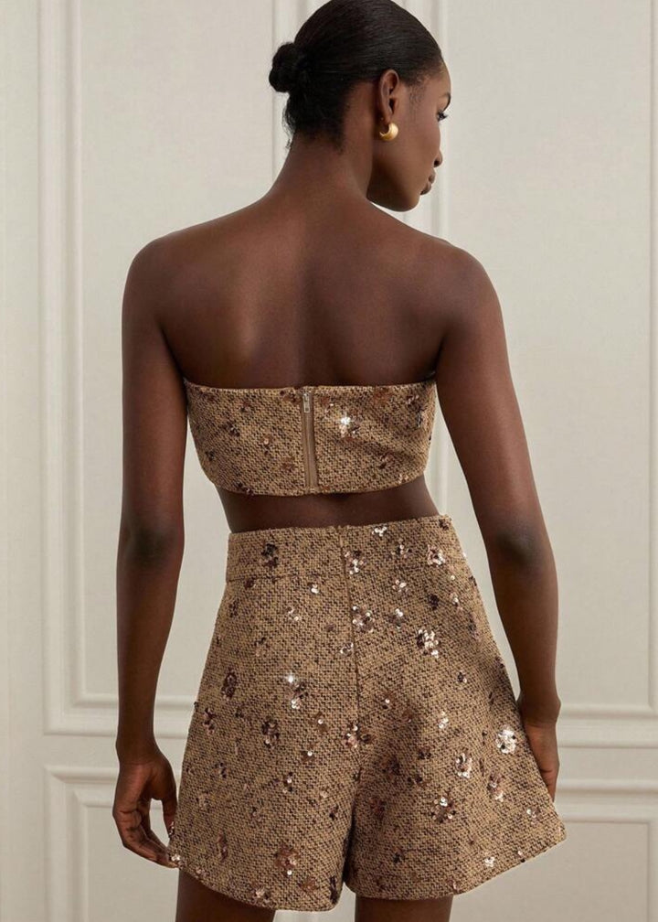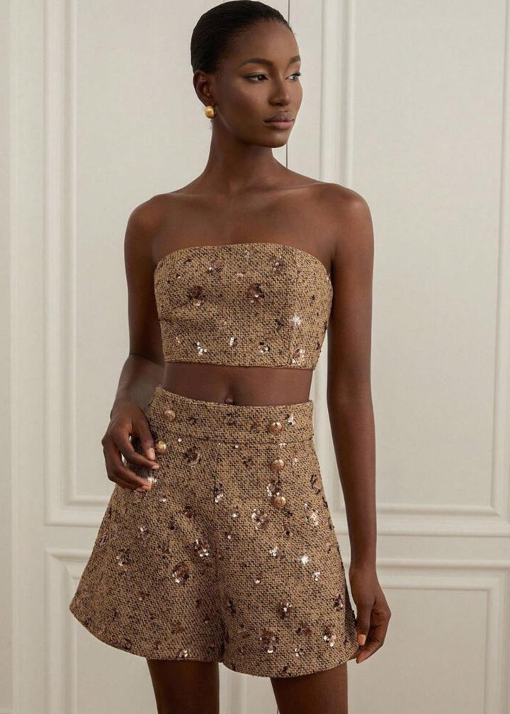 This chic two-piece shorts suit features a strapless crop top and high-waisted shorts, both embellished with subtle sequin detailing throughout a textured tweed fabric. The crop top offers a flattering silhouette, while the shorts are designed with a statement button-front closure and a comfortable, relaxed fit. This ensemble is perfect for making a sophisticated statement.