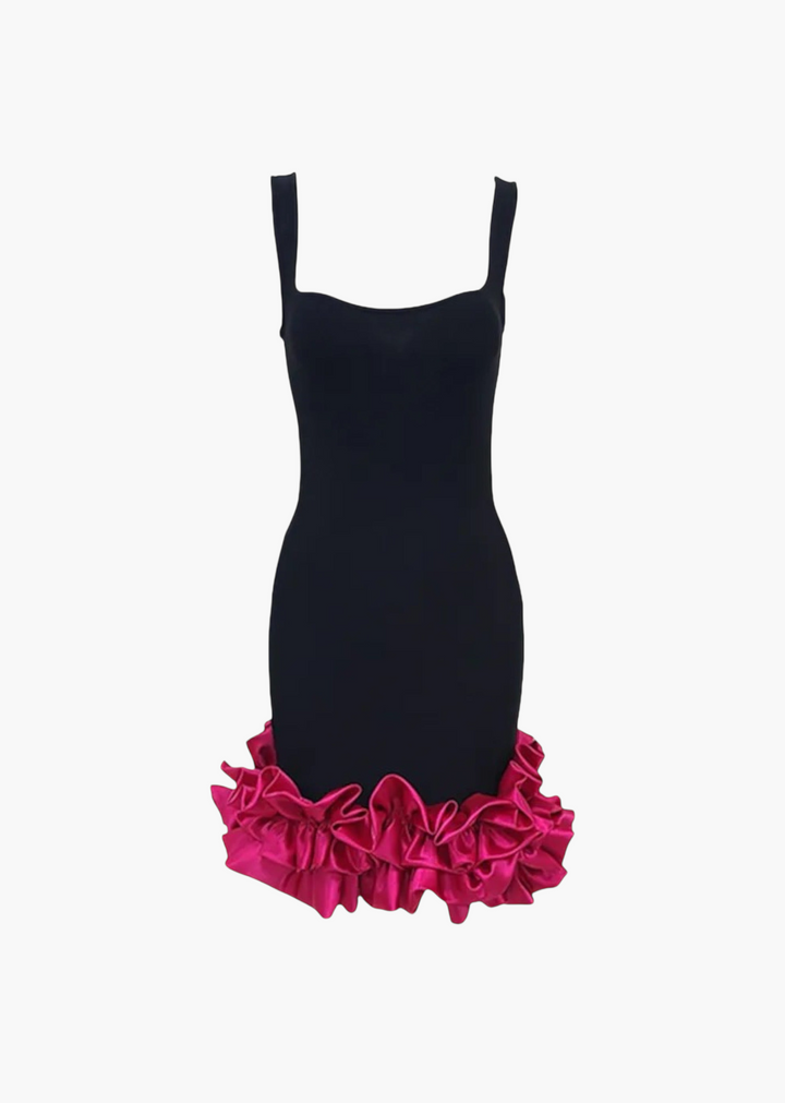 This dress is a fun, flirty take on structured bodycon wear. The main body features a scoop neckline and a sleeveless, fitted silhouette constructed from a shape-retaining bandage fabric. The contrast comes from the hemline, which is adorned with multiple layers of voluminous, gathered satin ruffles. The back features a zipper closure for a smooth fit.