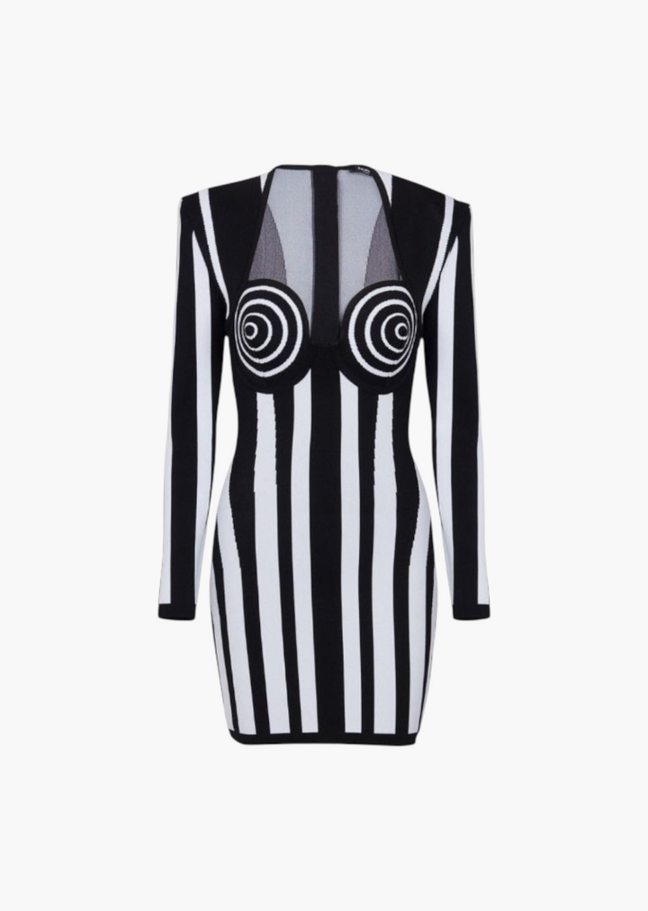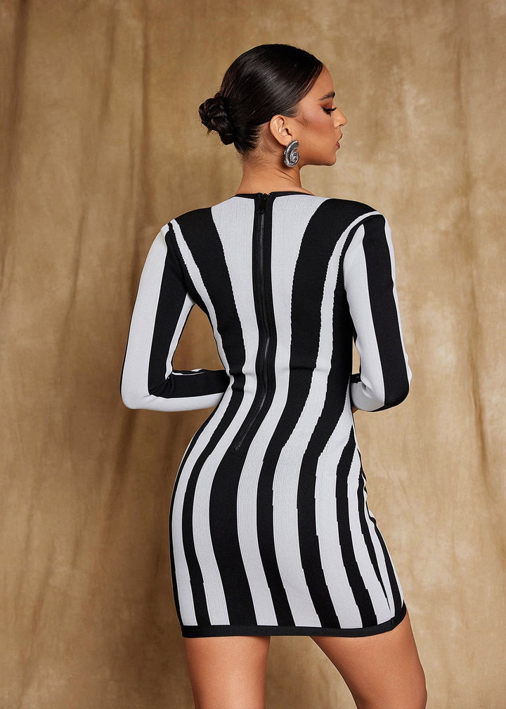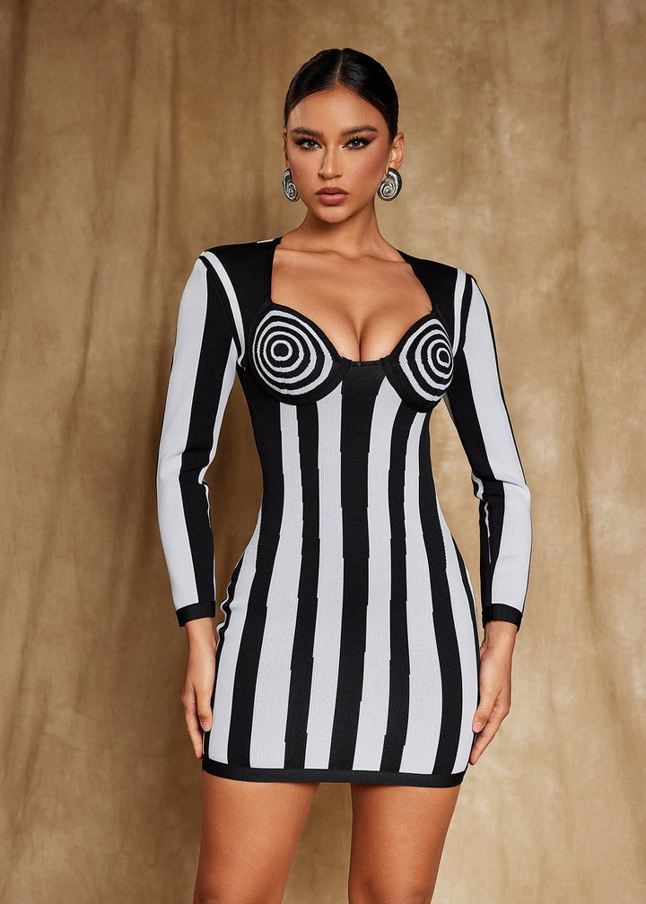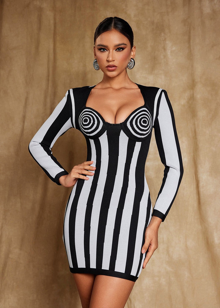 This mini dress features a form-fitting, bodycon silhouette crafted from a ribbed fabric with a striking stripe pattern. The dress has a sweetheart-style neckline and long sleeves. A vertical stripe pattern on the main body of the dress contrasts with a horizontal stripe pattern at the sleeves and chest. This piece is a modern and stylish choice for evening wear or parties.