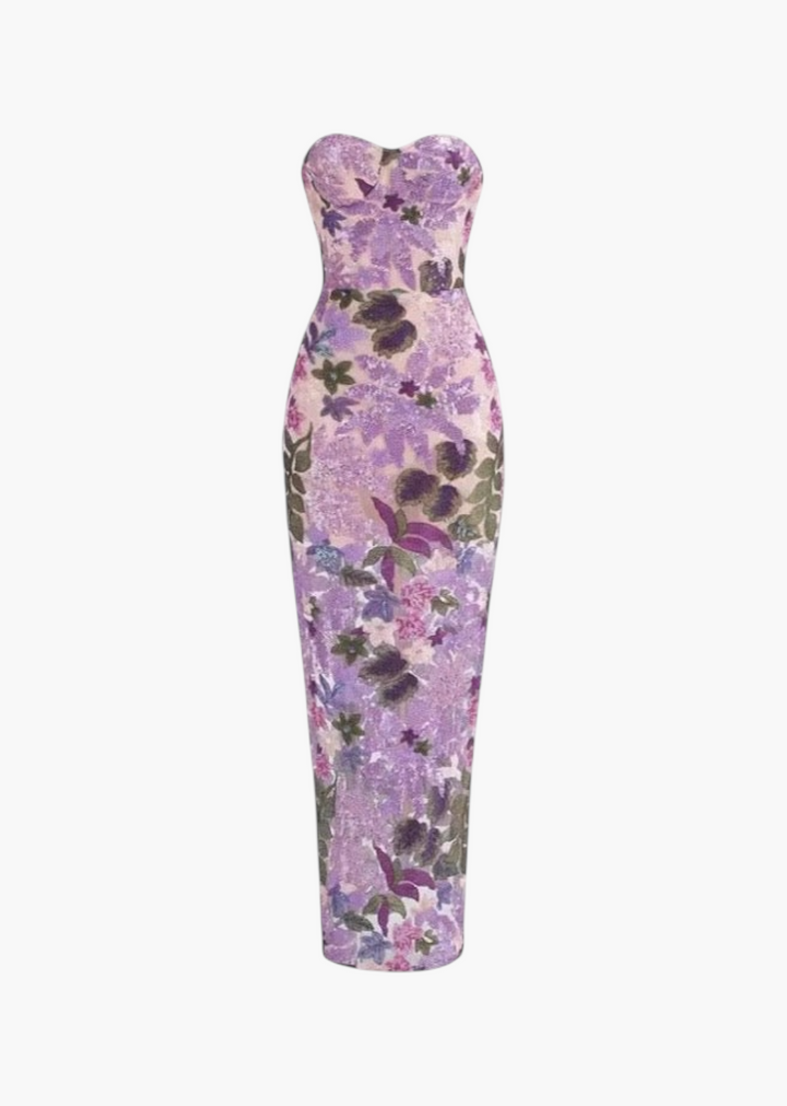 This gown is a sophisticated masterpiece of texture and design, perfect for making a memorable entrance. It features a strapless, fitted bodice and a floor-length column silhouette that gracefully hugs the body. The dress is constructed with a nude-toned base layer that acts as a subtle canvas for the exquisite, embroidered mesh overlay. This sheer overlay is meticulously adorned with a rich pattern of floral motifs and is further elevated by sparkling sequin embellishments that catch the light with every movement. The combination of intricate embroidery and shimmering sequins creates a luxurious and dynamic texture.