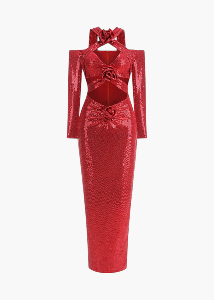 This show-stopping gown features a captivating design with long sleeves and elegant cold-shoulder cutouts. The bodice is intricately detailed with crisscross bands that create alluring cutouts across the bust and midriff. Three-dimensional rose appliques are strategically placed within these crisscross elements, adding a touch of texture and romanticism. The entire gown is adorned with shimmering sequins, ensuring a radiant sparkle with every movement. The silhouette is a form-fitting maxi length, designed to accentuate the figure, and includes a high slit in the skirt for ease of movement and added allure. A concealed back zipper provides a seamless finish. This gown is an exceptional choice for formal events, evening galas, or any occasion demanding a truly memorable statement.