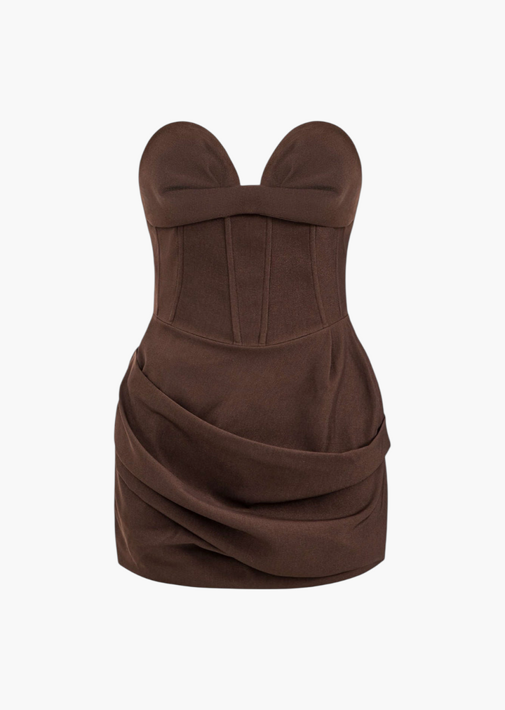 This sophisticated mini dress features a strapless design with a unique sweetheart neckline that subtly dips in the center. The bodice has a structured corset-inspired construction with visible seams that enhance the figure. The skirt showcases asymmetrical draped fabric detailing that adds texture and visual interest. The overall silhouette is fitted through the bodice and transitions into a draped, subtly voluminous skirt. This dress is a stylish choice for evening events or special occasions.