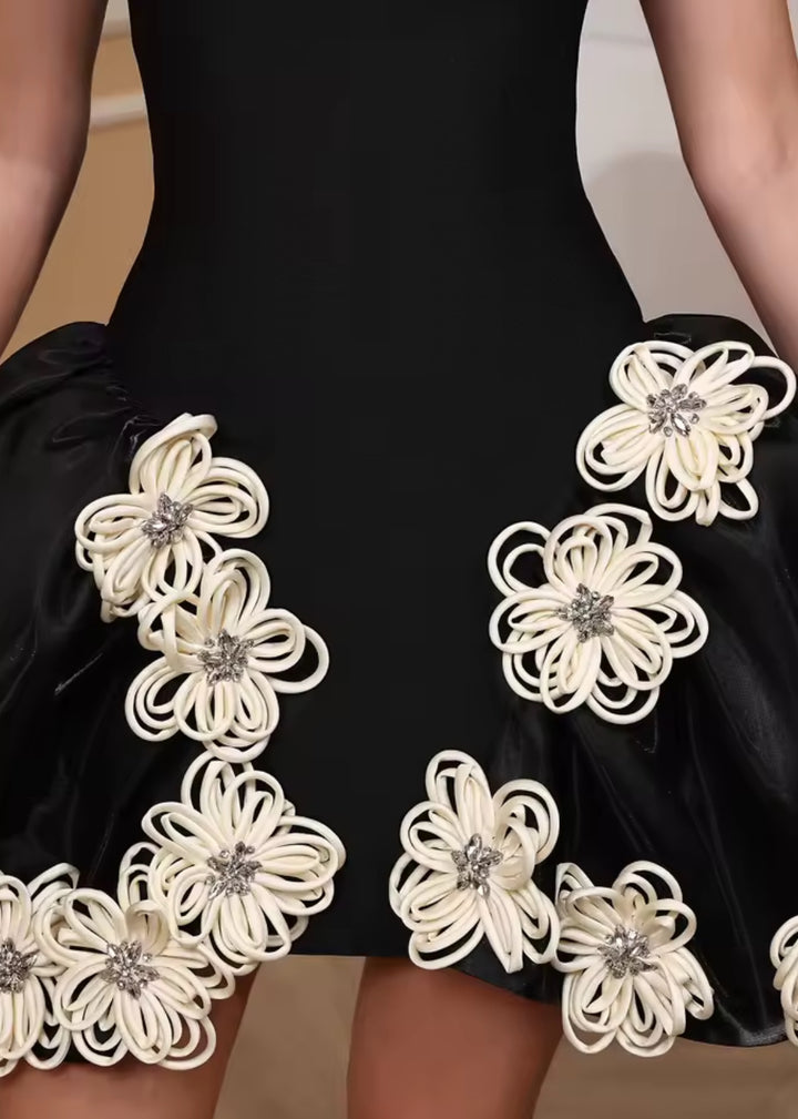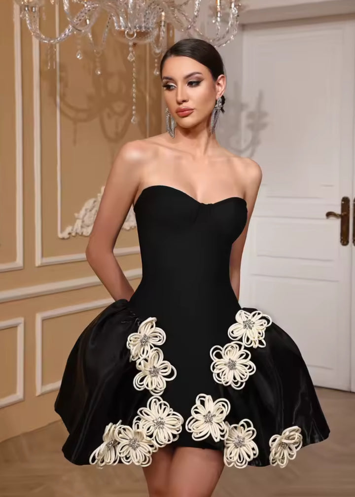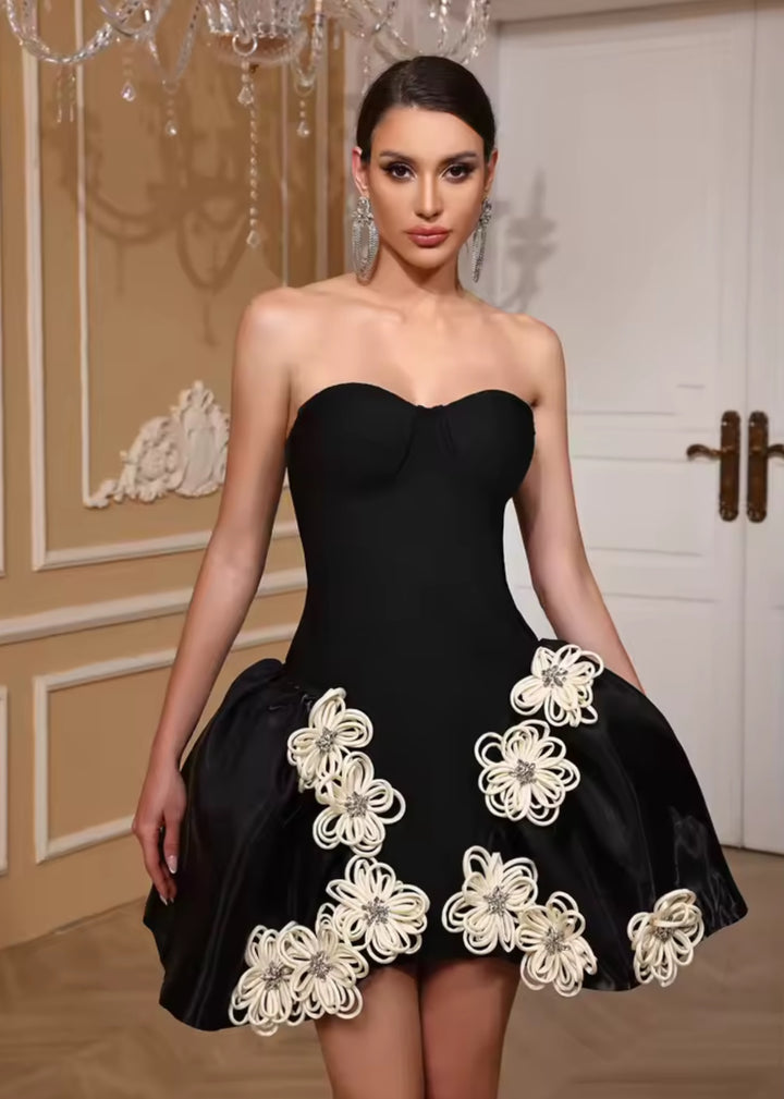 This exquisite mini dress is designed to make a memorable statement with its unique structure and intricate details. It features a classic strapless sweetheart neckline that gracefully accentuates the décolletage. The bodice is sleek and form-fitting, leading down to a dramatic, voluminous puff hem that gives the dress a playful yet sophisticated silhouette. The hem is further enhanced with scattered, textured floral appliques, adding depth and visual interest. Crafted from a combination of smooth and structured fabrics, this dress offers a luxurious feel and a striking profile, perfect for special occasions.