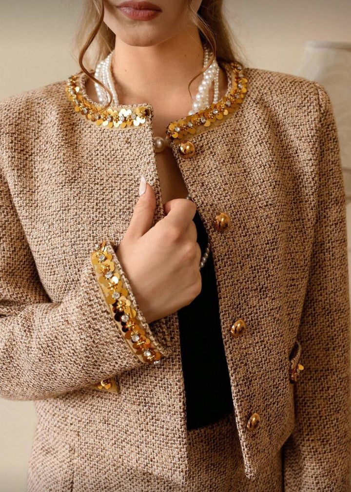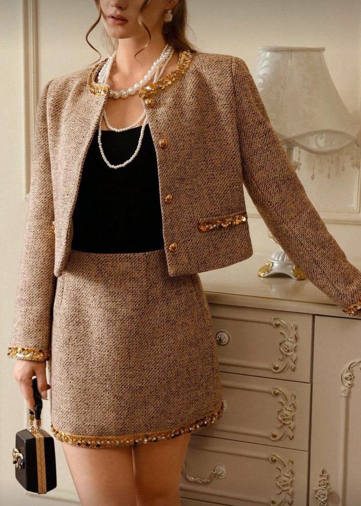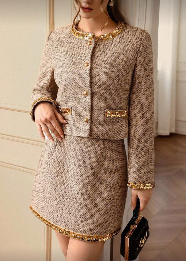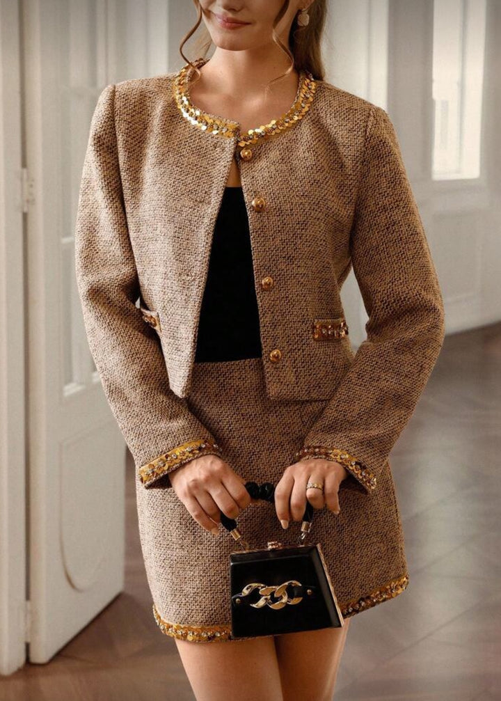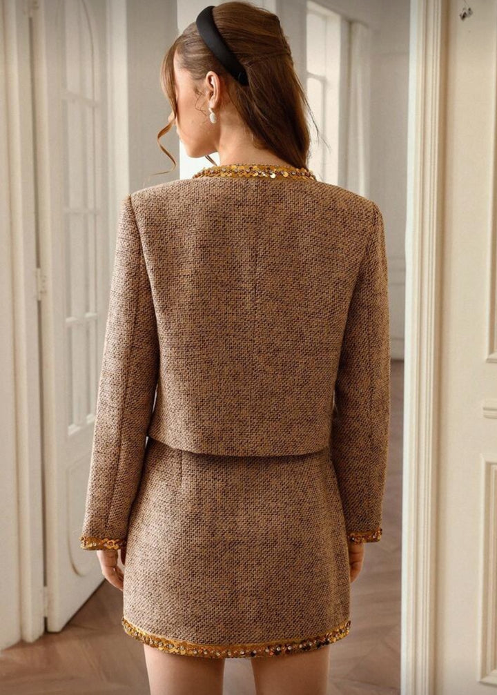 This two-piece set is crafted from a textured tweed fabrication and features a collarless jacket and a matching mini skirt. The jacket has a round neckline and a button-front closure, while both the jacket and skirt are elegantly trimmed with shimmering sequin embellishments along the neckline, cuffs, pockets, and hem, adding a touch of glamour.
