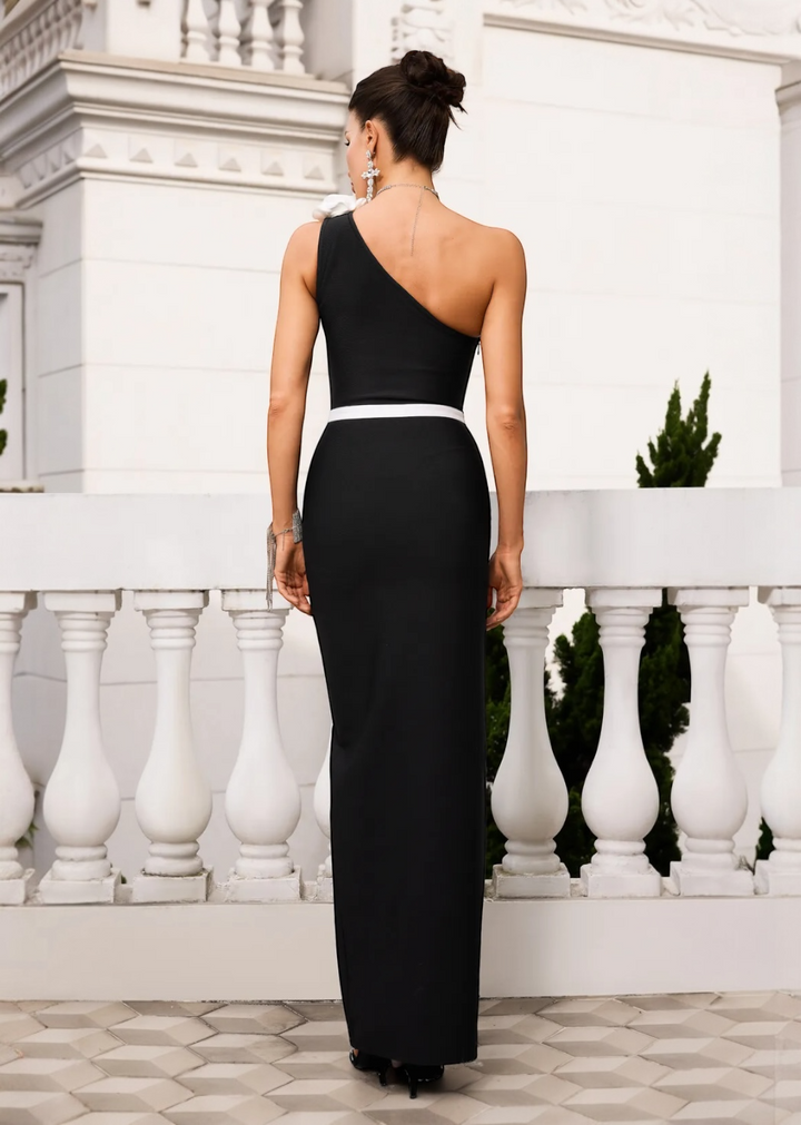 This elegant maxi dress features a sophisticated one-shoulder neckline adorned with a cluster of three-dimensional floral appliques. The dress has a fitted silhouette and extends to a floor-length hem with a high slit on one side, allowing for ease of movement. A contrasting band detail cinches the waist, accentuating the figure. This gown is a stylish choice for formal events, evening galas, or special occasions.
