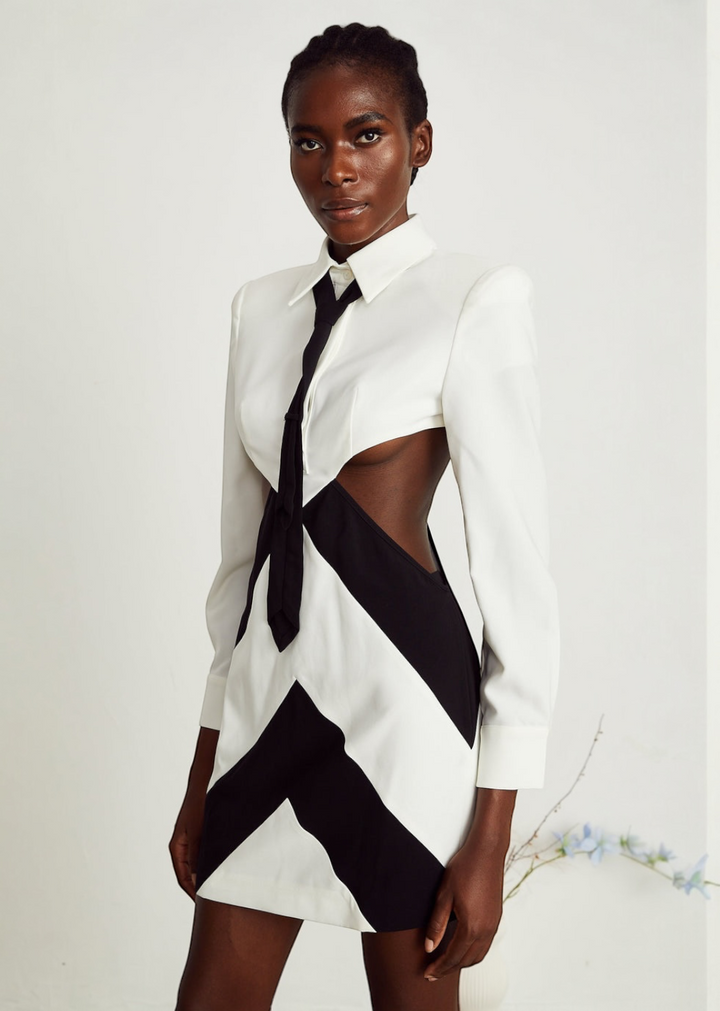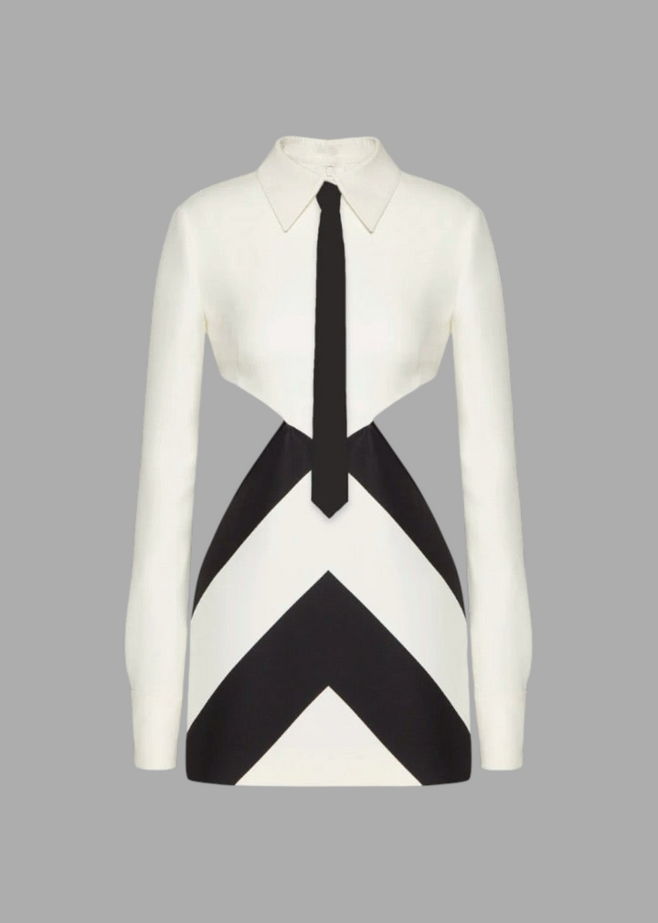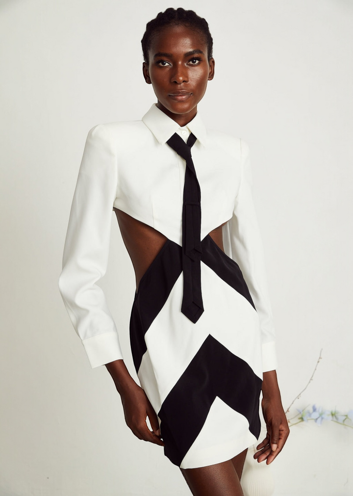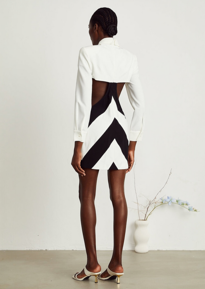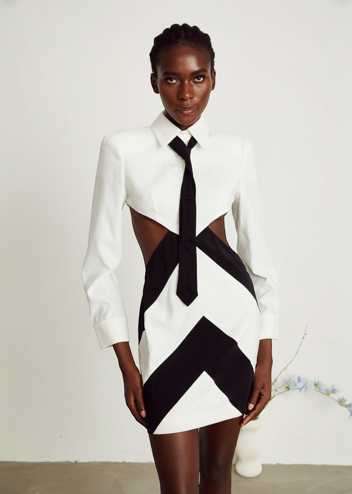 This mini dress offers a fresh take on classic shirting with a structured design. It features a collared neckline with notched lapels and long sleeves with button cuffs. The dress has striking geometric cut-outs at the waist that lead to an open back. It is cinched at the waist by a removable tie.