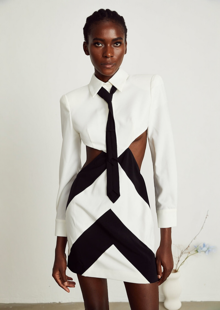 Style Tips For a bold, fashion-forward look, pair this dress with minimalist heels or pumps to keep the focus on the design. A simple clutch would complement the outfit. The structured top and daring cut-outs create a balanced look that requires minimal accessories to stand out.