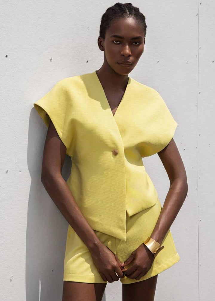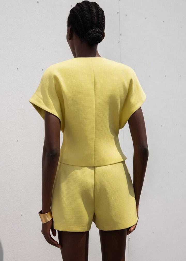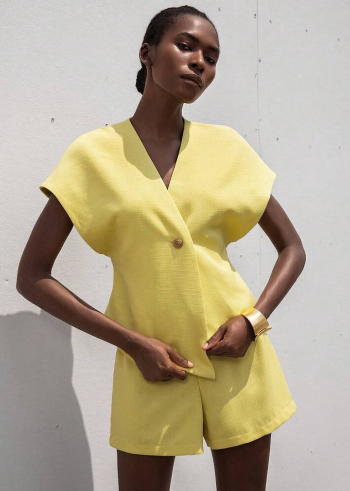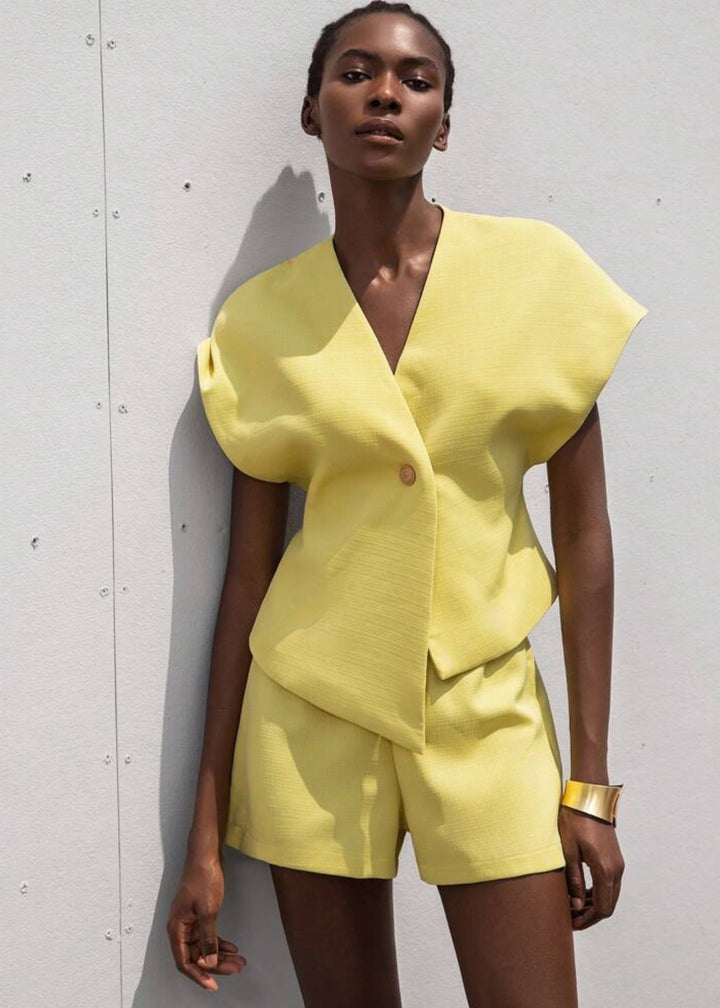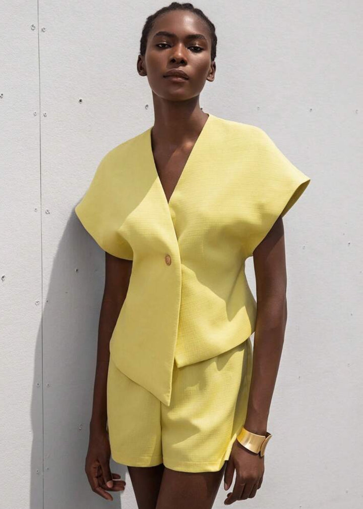 This top is a modern and architectural piece, featuring a sharp V-neckline and a unique asymmetrical button closure that adds a distinctive touch. It boasts dramatic flutter sleeves that create volume and a sculptural silhouette around the shoulders. The top has a slightly cropped length, designed to sit perfectly with high-waisted bottoms, making it an ideal choice for a sophisticated and contemporary ensemble.