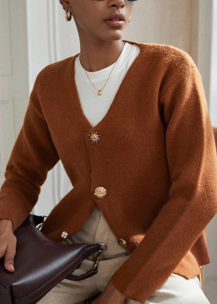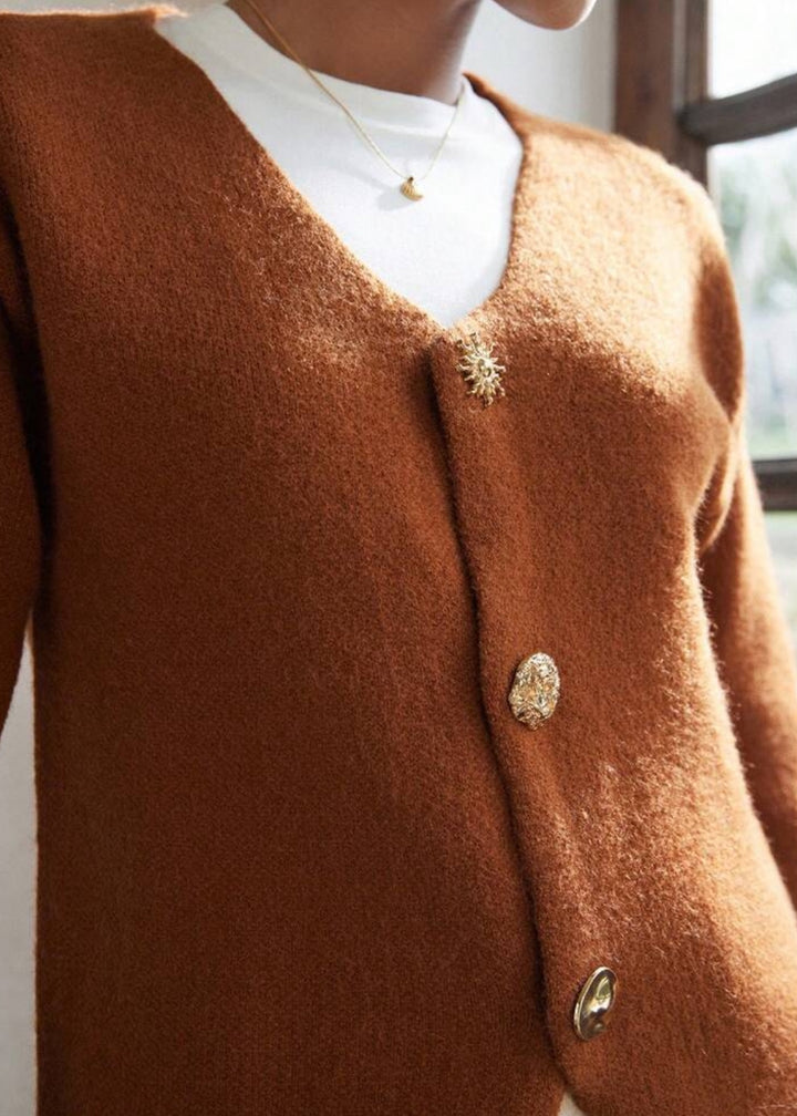 This cardigan features a V-neckline and a button-front closure with a mix of decorative buttons. It has long sleeves and a slightly cropped length, designed for a relaxed yet refined fit. The knit fabric has a soft, textured finish, making it an ideal layering piece.