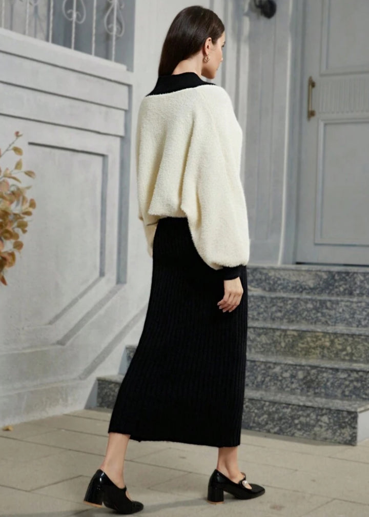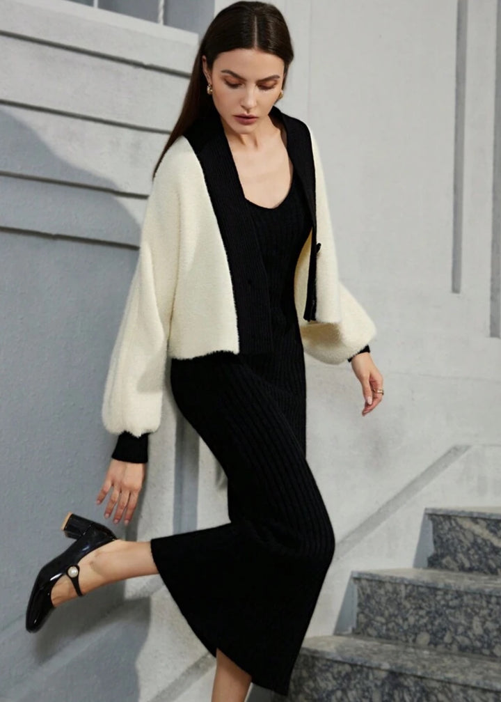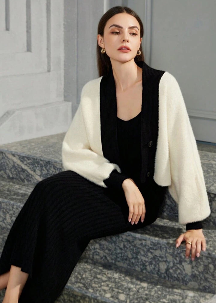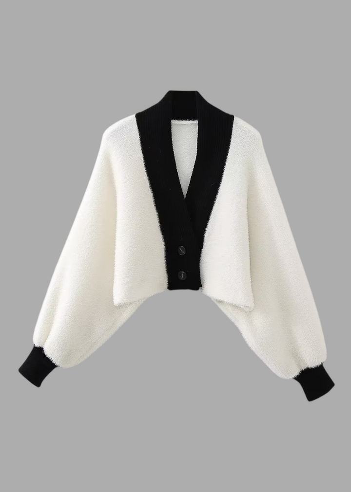 This stylish cardigan features a contrasting V-neckline and a unique wrap-style closure at the front. The soft, plush knit fabric is complemented by long puff sleeves with ribbed cuffs, creating a modern and comfortable silhouette. It is secured with two buttons at the waist, adding a polished finishing touch.