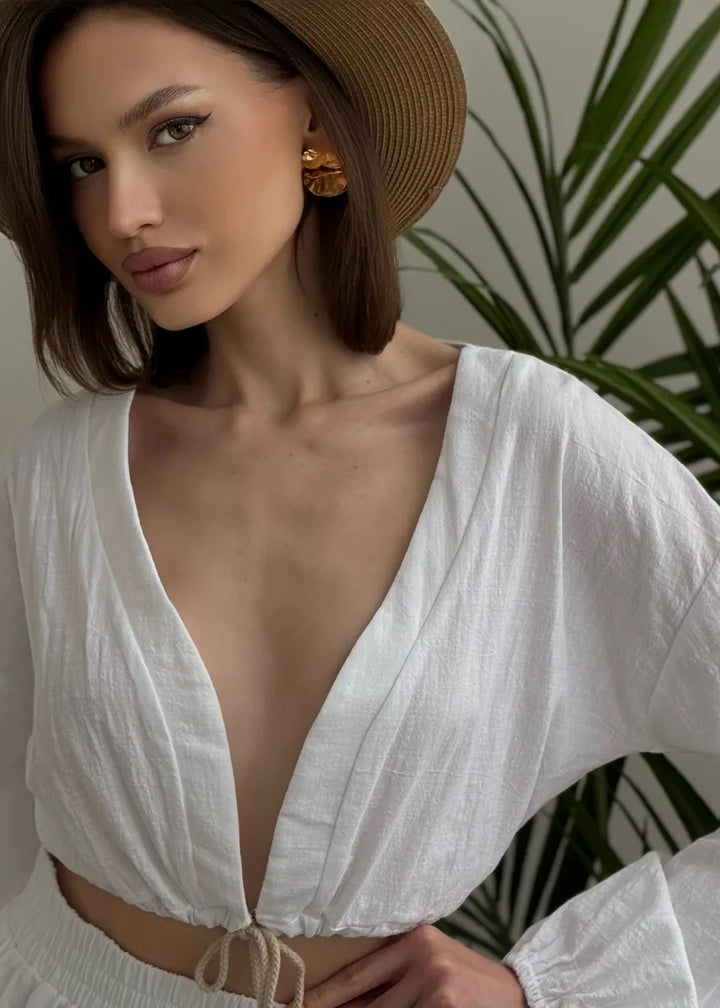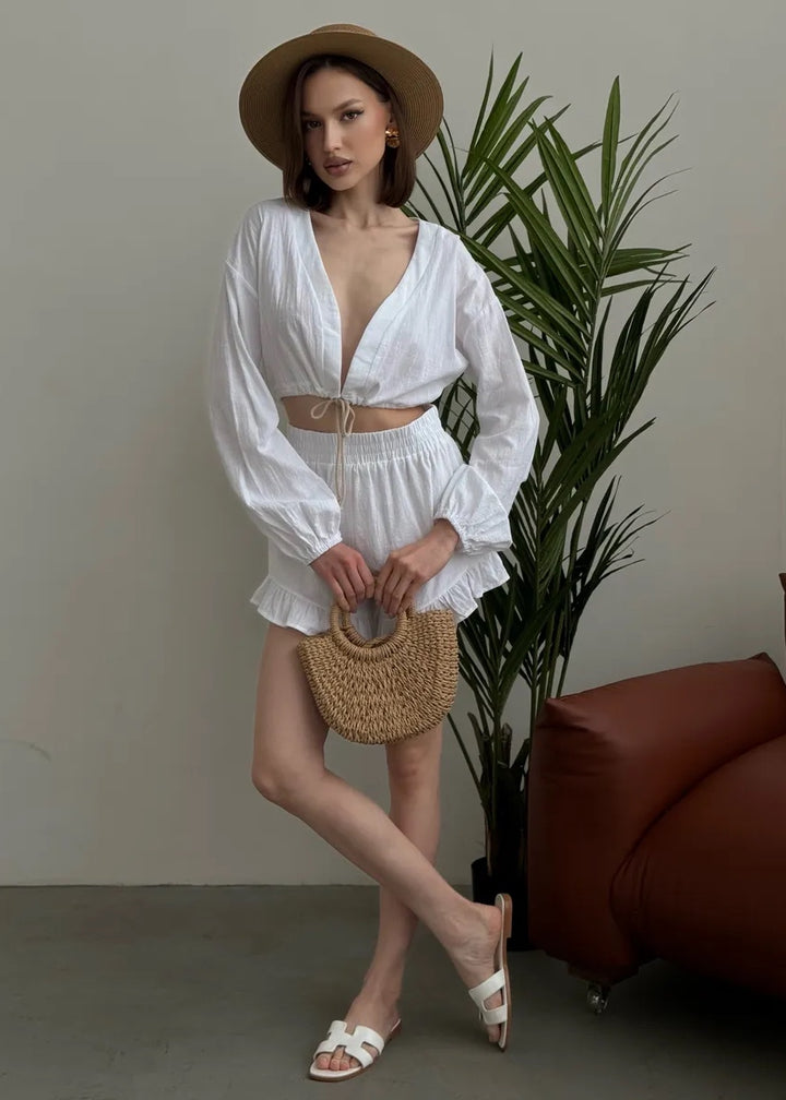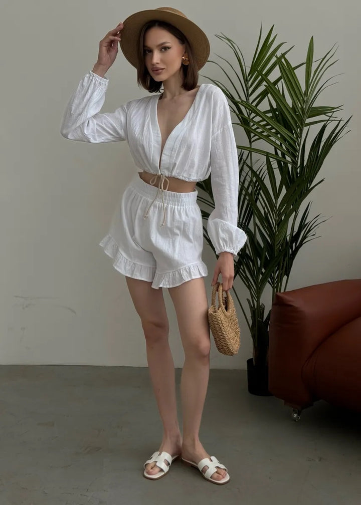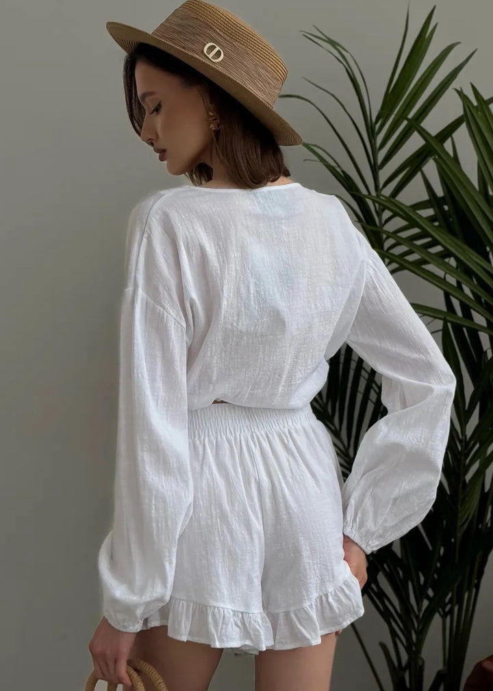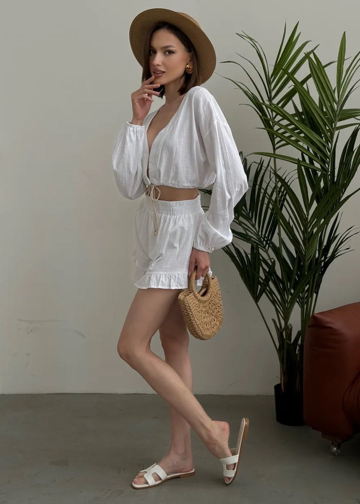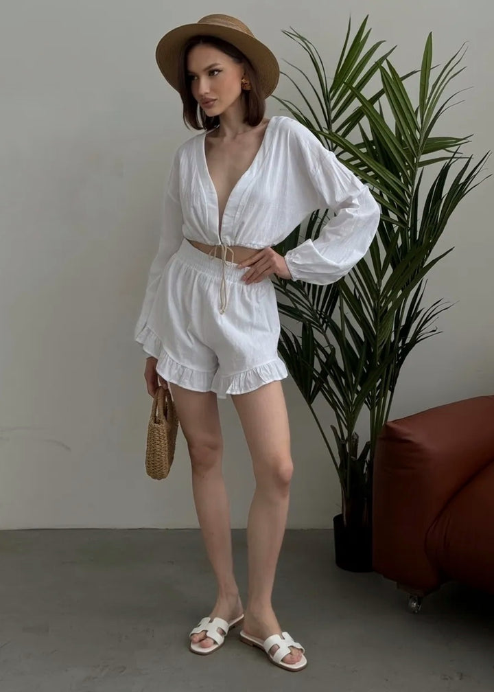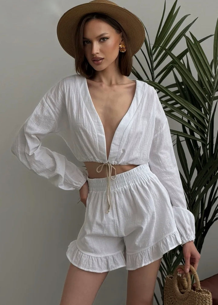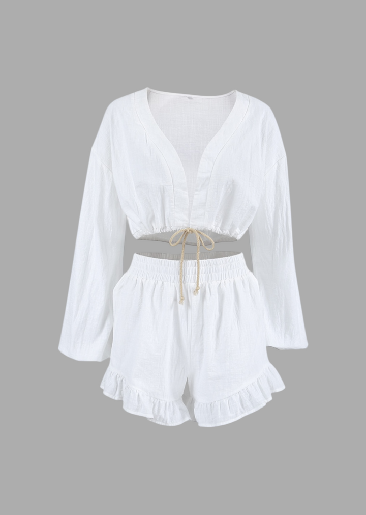 Step into effortless style with our Crochet Tie Front Long Sleeve Ruffled Shorts Set. This charming cotton ensemble features a cropped top with a deep V-neckline, accentuated by a tie detail that adds a playful twist. The matching shorts feature ruffled hems for a feminine touch, making this set perfect for warm-weather outings or casual gatherings.