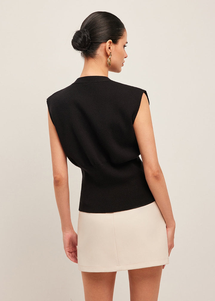 This sleeveless top is designed in a fitted, vest-style silhouette with a deep V-neckline. It features a single, large button closure at the waist, which is a prominent decorative element. The top is constructed from a textured fabric and has a peplum-like structure that flares slightly at the hem. This top can be worn on its own or as a stylish layering piece.