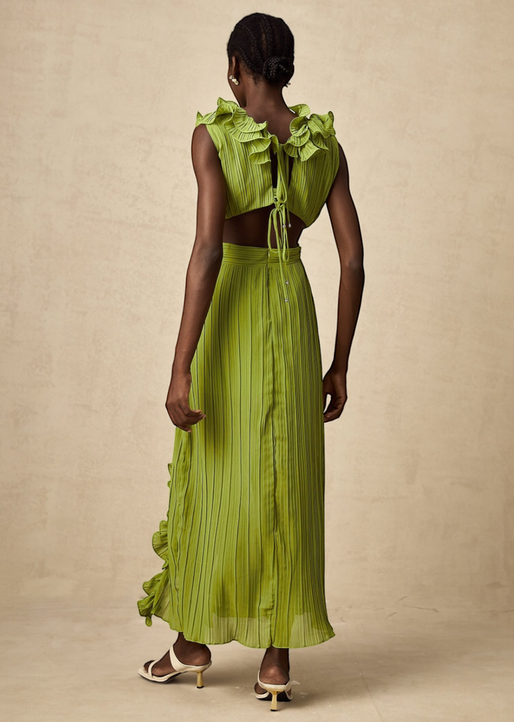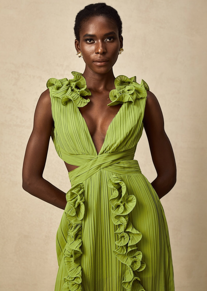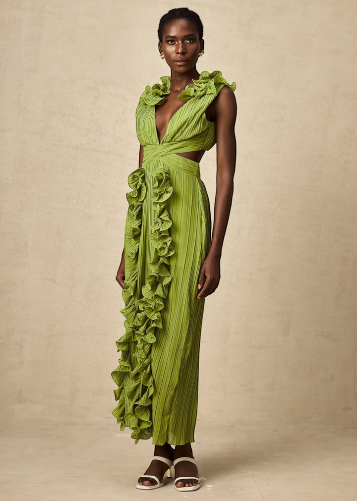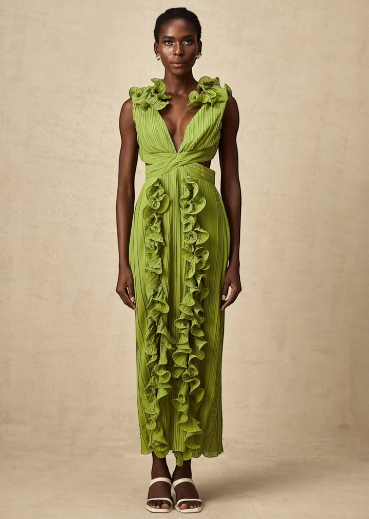 Styling Tips Pair this dress with simple strappy heels to complement its long silhouette. Keep accessories minimal to let the ruffles and pleats stand out. A simple gold or silver bracelet would be an ideal choice. For a formal event, a sleek bun would highlight the neckline and the details of the dress.